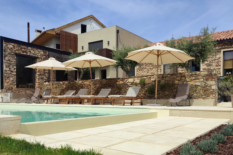 As paredes originais da pequena construção foram transformadas em refeitório do alojamento rural recentemente inaugurado. O edifício preserva os detalhes das raízes, mas como qualquer árvore que se altera dinamicamente ao longo do tempo construiu sobre elas quatro apartamentos plenos de modernidade. Conforto e distinção combinam-se num espaço tranquilo, com uma arquitetura que isola da rua e orienta o olhar para a serra das Talhadas, onde se ergue há pouco mais de um ano um miradouro panorâmico com assinatura de Siza Vieira.