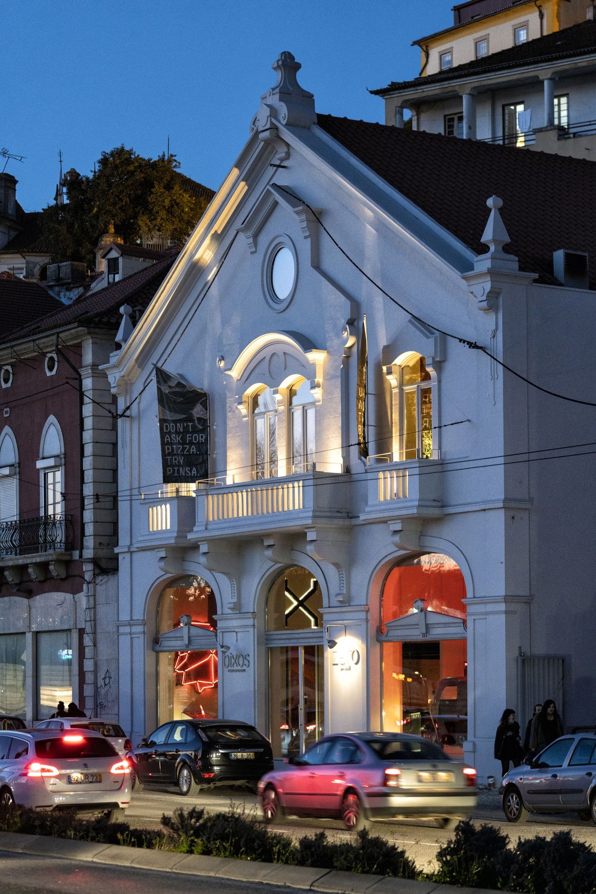 É na antiga garagem Santa Cruz, na Avenida Emídio Navarro, que se encontra o Bixos / Zero Box Lodge Coimbra, misto de alojamento, restaurante e bar. O espaço – nas mãos da Mainside, responsável por projetos como a LX Factory, em Lisboa, ou o Zero Box Lodge Porto – abriu há pouco mais de um ano, renovado, mas mantendo resquícios do tempo em que foi garagem, gasolineira e stand de automóveis. A decoração integra velhos pontos de abastecimento de combustível, e na receção do Zero Box Lodge lê-se “auto garage” em neons vermelhos – utilizados também para assinalar os números dos quartos-cápsula.