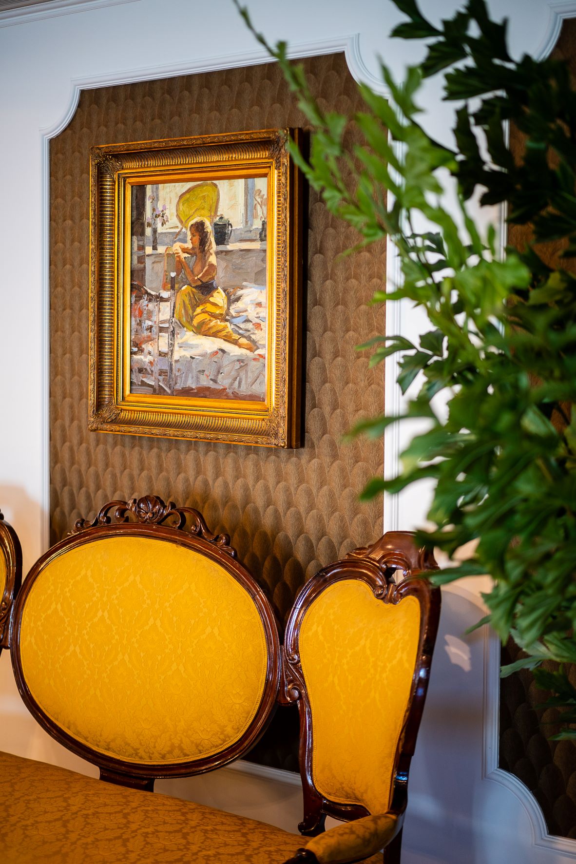A sala de refeições tem nas paredes telas de Diogo Navarro, inspiradas em coreografias de Olga Roriz (também nascida em Viana do Castelo), e expõe bordados tradicionais da artesã vianense Conceição Pimenta. Emanuel Freitas chama a atenção para um instrumento naquele espaço: “Vamos ter piano ao pequeno-almoço”.