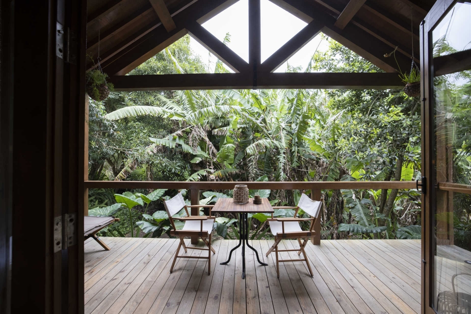 Embrenhadas na vegetação exuberante de São Miguel, com a folhagem das bananeiras quase a entrar pela varanda, as duas cabanas em madeira do novo Senhora da Rosa Tradition & Nature Hotel são sinónimo de tranquilidade e um verdadeiro refúgio na natureza. O quarto, com a cama voltada para uma grande varanda aberta para o quadro verde da ilha, tem ainda uma banheira ao ar livre e uma ventoinha de teto para os dias mais quentes – além do ar condicionado -, tudo embalado pela sinfonia da avifauna que parece trazer a natureza para dentro. As casas são inspiradas num antigo cafuão – uma estrutura típica açoriana onde eram guardados os cereais, elevada sobre estacas para que os ratos não conseguissem entrar – que existia nesta propriedade familiar do século XVIII, onde chegou até a funcionar uma estalagem, fundada pelos pais de Joana Damião Melo. Depois de 10 anos ao abandono, Joana, juntamente com o irmão, Miguel e o sócio José Pedro Sousa, voltou a adquirir a quinta onde cresceu e transformou-a num hotel que celebra a tradição e a natureza.