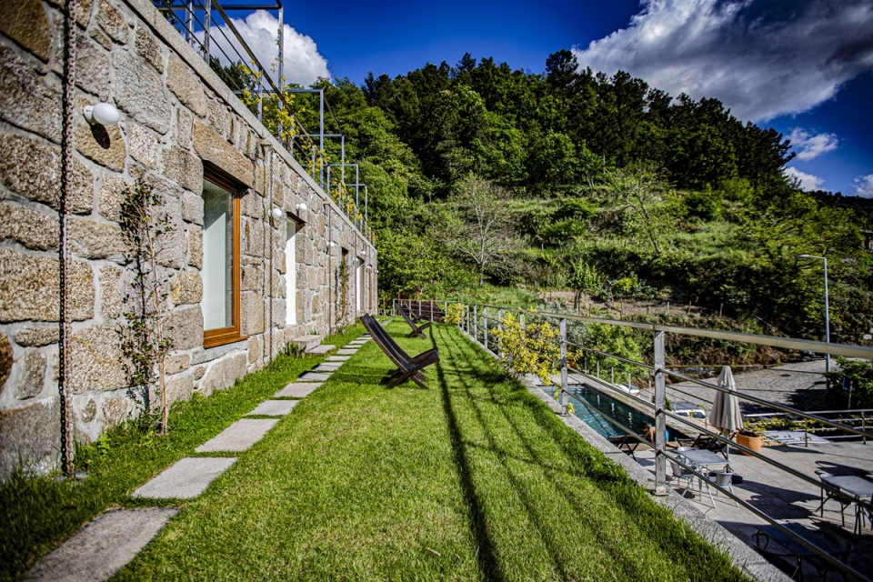 A premissa foi conjugar o granito e a madeira da casa original com as linhas depuradas da arquitetura moderna e apostar num design de interior contemporâneo. O burel toma conta dos revestimentos têxteis, mantas, cortinas, sofás e cadeirões, enquanto peças de mobiliário fazem referência ao design nacional dos anos 1950.