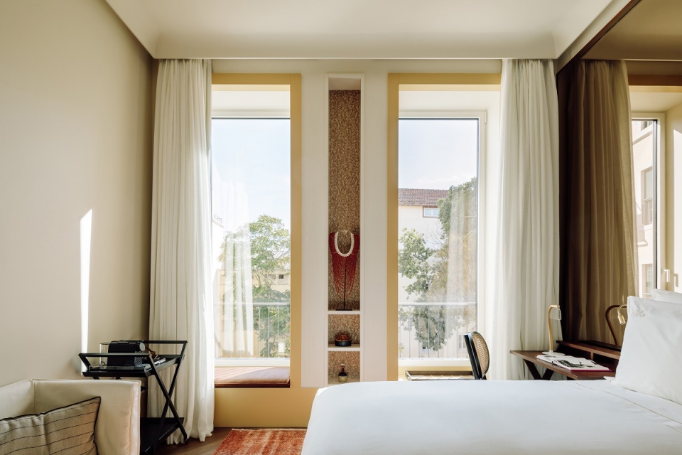 Já pelos 87 quartos, estes da autoria de Cristina Matos, a decoração é mais sóbria, apostando-se nos beges, brancos, dourados e verdes, e deixando-se a inspiração exploradora e tribal em detalhes como as carpetes e os papéis de parede, mas também nos livros e revistas de viagens. As altas janelas trazem para dentro a luz de Lisboa em doses generosas e as vistas variam consoante o quarto ou suite, ora para o bairro, ora para o Tejo, para as suites que têm varanda, onde podem dormir até quatro pessoas.