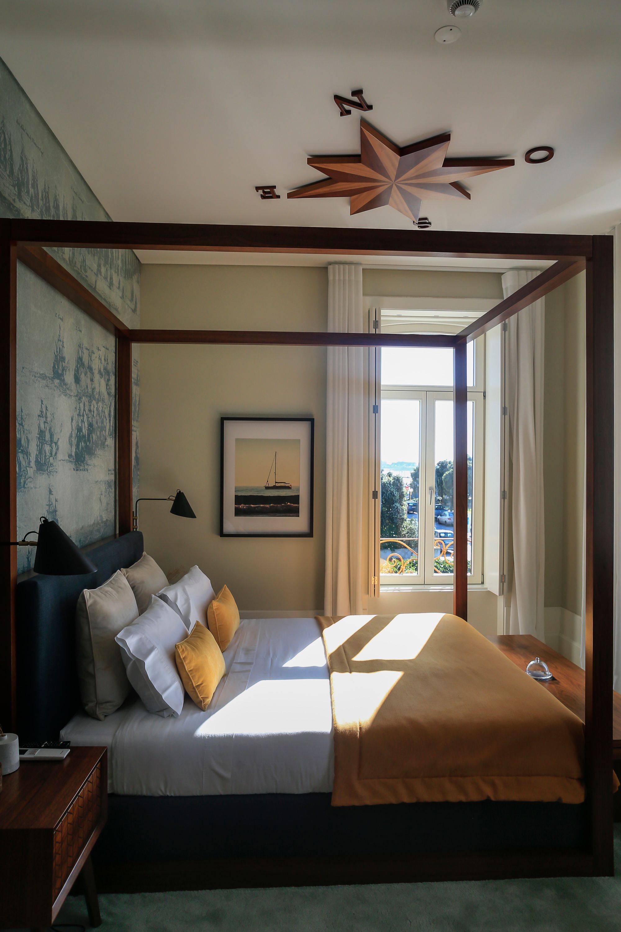 Entrando-se nos seis quartos duplos, onde a paleta de cores suaves viaja pelos azuis, os amarelos e os carmins, surgem detalhes como uma rede de pescadores, uma rosa-dos-ventos no teto e um conjunto de cordas que fazem as vezes de um dossel em madeira.