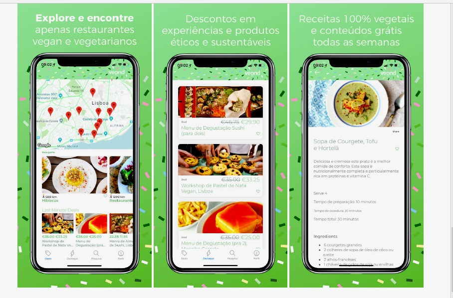 A Veond (veondapp.pt), para já apenas disponível para Apple, reúne de ofertas promocionais para vegans, vegetarianos e simpatizantes. É uma rede à escala nacional que apresenta descontos em restaurantes, produtos, experiências e também partilha receitas. Os proprietários de negócios dentro desta área podem lá adicionar as suas propostas.