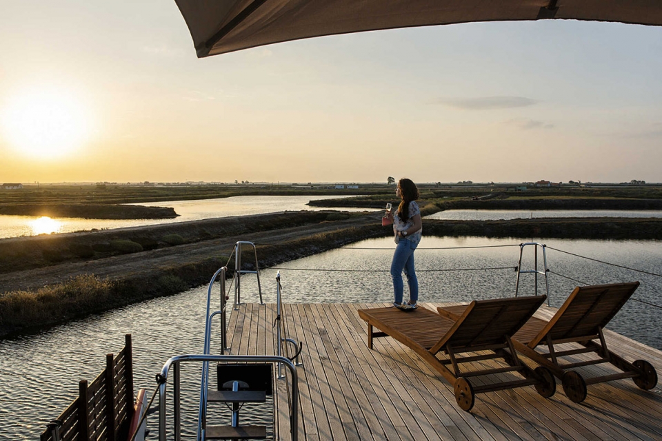 Passar a noite num barco rodeado pela beleza natural da laguna aveirense é proposta da Ostraveiro, que desde o ano passado tem dois barcos-casa a flutuar na ria. Cada um deles, construídos à base de madeira e cortiça, e alimentados a energia solar, tem uma área de 40 metros quadrados e capacidade para quatro pessoas. O alojamento é composto por um quarto envidraçado, voltado a poente, e uma sala com kitchenette, com vista para as salinas, e está ainda equipado com casa de banho, sofá-cama e uma varanda com mesa e cadeiras, ideal para tomar o pequeno-almoço, deixado de véspera no barco. No terraço, encontram-se espreguiçadeiras e guarda-sóis.
