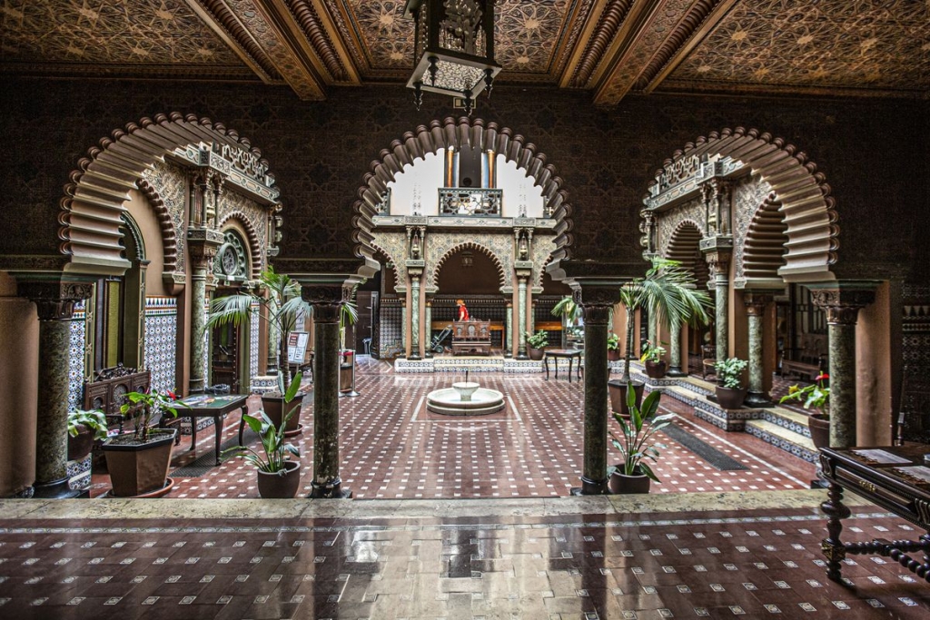 O ponto de encontro é no impressionante pátio principal, pedra de toque do estilo revivalista que lhe conferiu arcos, janelas e plantas tropicais próprios de um qualquer destino do Norte de África, e que inspiram muitas fotografias. Em jeito de curiosidade e com alguma piada, o guia explica que muitos estrangeiros, ao olhar para o ambiente, assumem que as casas do Alentejo são assim – neoárabes -, mas logo explica que o que se vê foi herança das modificações introduzidas pelo Casino Majestic (talvez o primeiro de Lisboa), que abriu ali em 1918, no então Palácio Alverca, construído no século XVII.