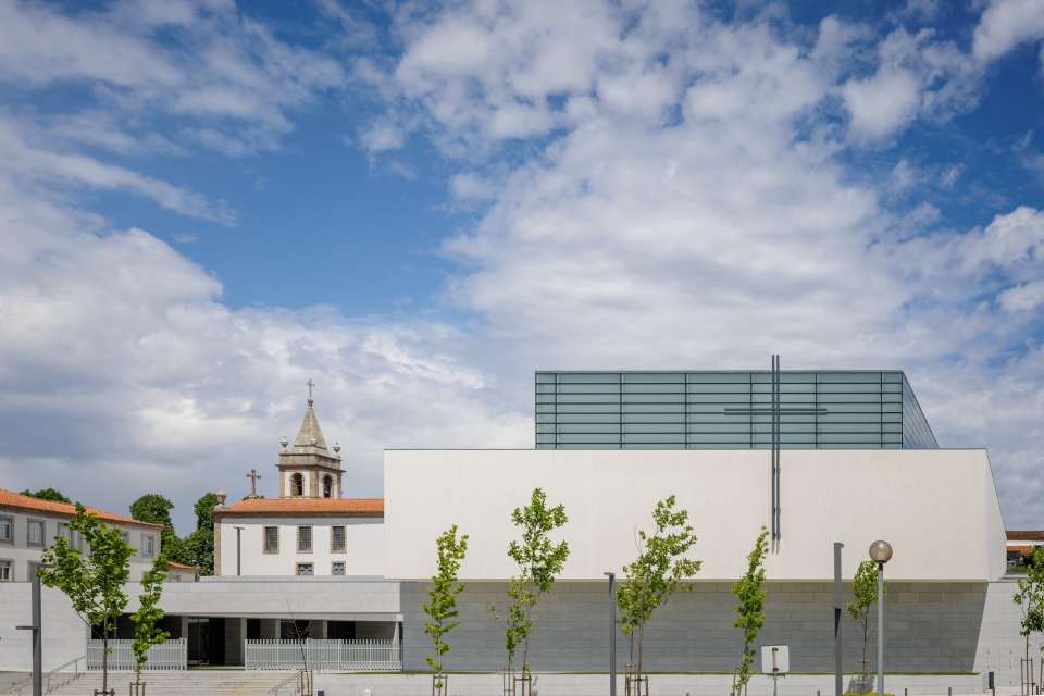 O passado e o presente convergem num mesmo quadro à entrada da Igreja do Divino Salvador, em Freamunde. O pavilhão de linhas retas e sóbrias foi erguido nas traseiras na Igreja Matriz, um templo setecentista, que espreita por cima da parede em granito que delimita o adro do novo santuário. “É a ligação entre o antigo e o novo, que simboliza a continuação do caminho que a comunidade vai trilhando”, comenta o padre Manuel Brito, que acompanhou a edificação da nova igreja, em resposta à necessidade da paróquia em ter um espaço maior.