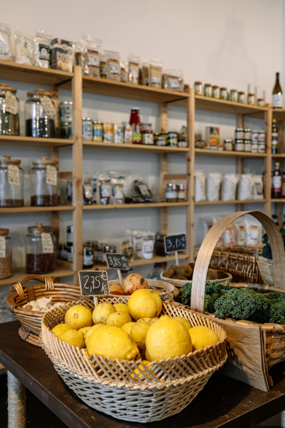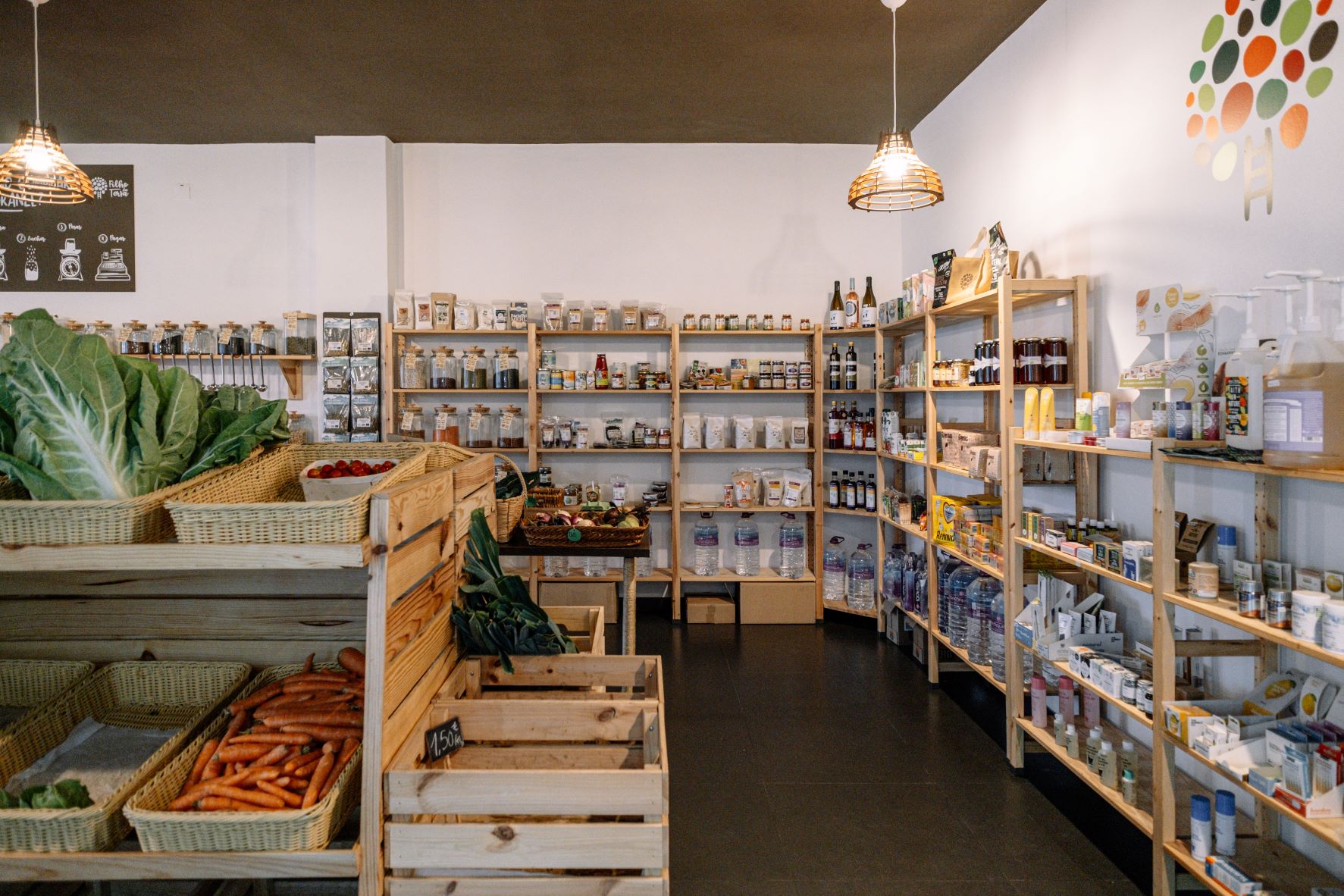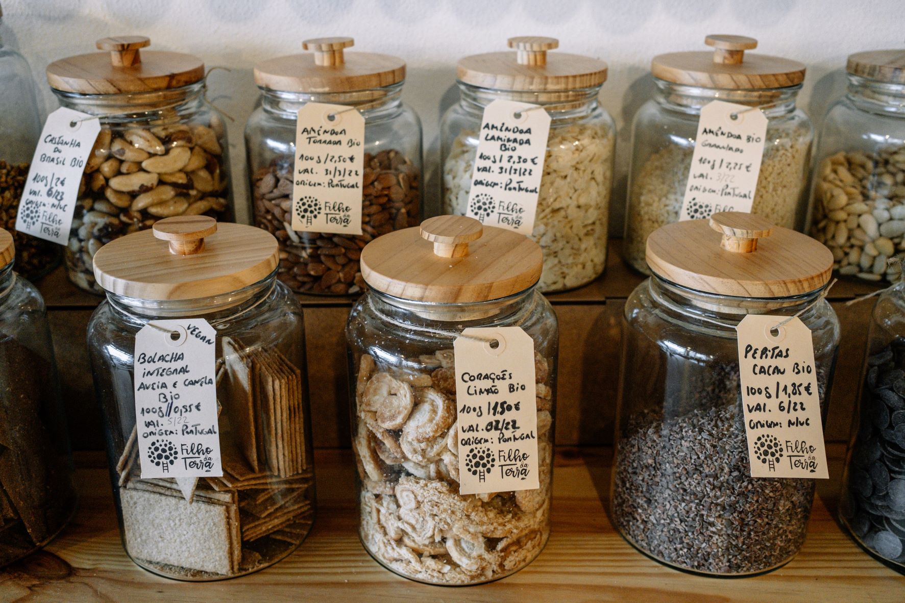 Logo à entrada impressiona a quantidade de frascos de vidro alinhados nas prateleiras em madeira, que acomodam flocos de cereais, granola, infusões, chás, biscoitos, bolachas, crackers, farinhas, feijão e grão, quinoa, e frutos secos. Ao centro, no topo dos galinheiros – ali usados como armários -, arrumam-se as especiarias, como os fragrantes cominhos e a paprika fumada. Dentro de cestos, ao fundo da loja, estão aconchegados os frescos que chegam vindos de Vila Nova de Famalicão, do Marco de Canaveses, de Amarante e de Tomar. A oferta, que se vai adaptando à sazonalidade, incluía, à data da visita, cebola, alho, nabo, cenoura, batata, couve, chuchu, beterraba, beringela, e fruta, como laranja, tangerina, pêra e maçã. A ideia é que o cliente se sinta confortável para levar apenas o que precisar, explica Carlos, dando como exemplo o ato de comprar apenas um ovo ou um grama de especiarias.