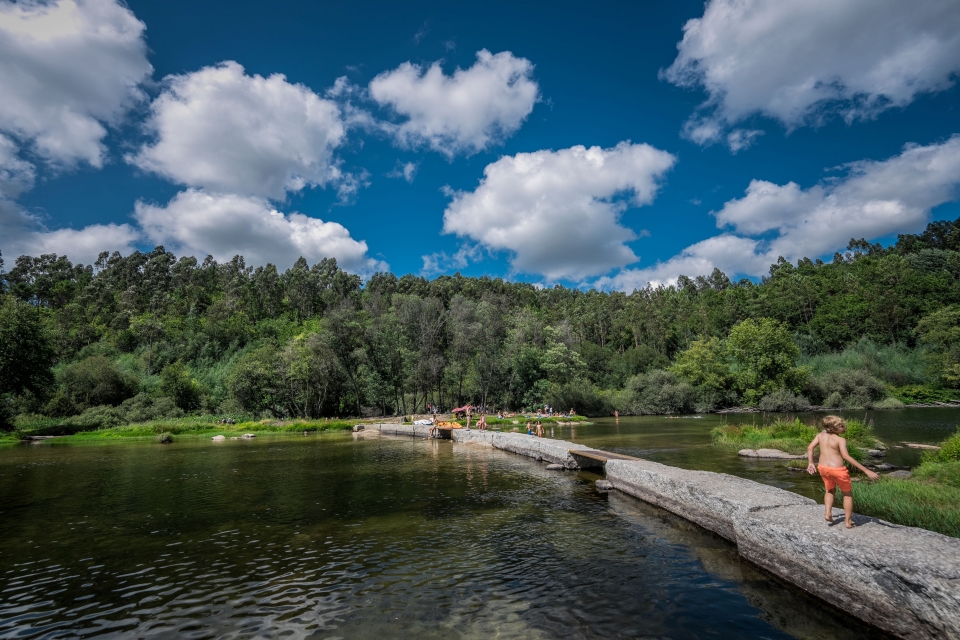 Não falta espaço para estender a toalha, nas duas margens do rio. Acede-se pelo lado sul, mas é possível atravessar para a margem oposta por cima dos blocos de granito do açude que serve para garantir a profundidade e a calma das águas. Para quem gosta de nadar é difícil encontrar um local, na zona vigiada, com profundidade para o fazer. É um lugar ótimo para as crianças, até porque a água é tépida e o espaço é permanentemente vigiado por dois nadadores salvadores, de 15 de junho e 15 de setembro.