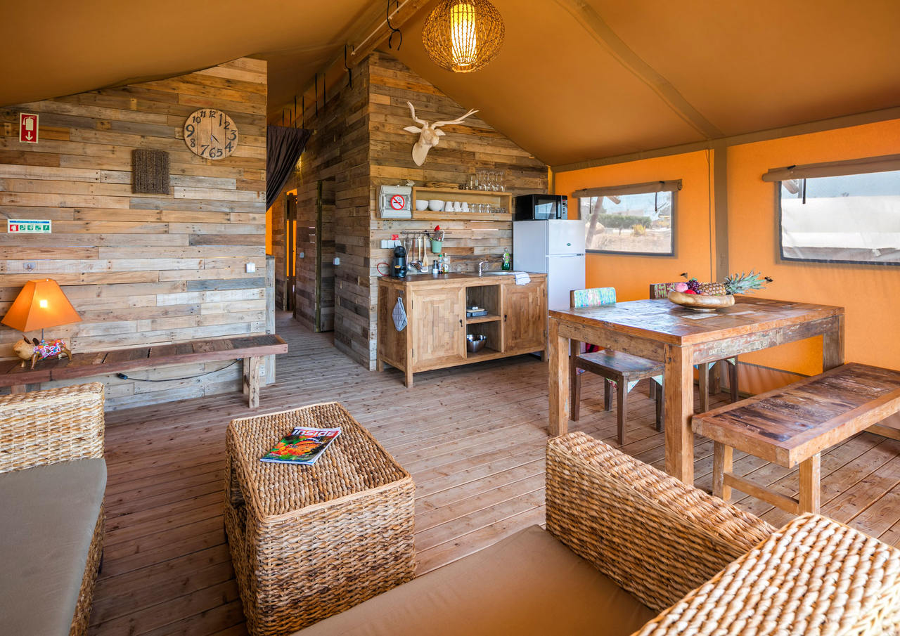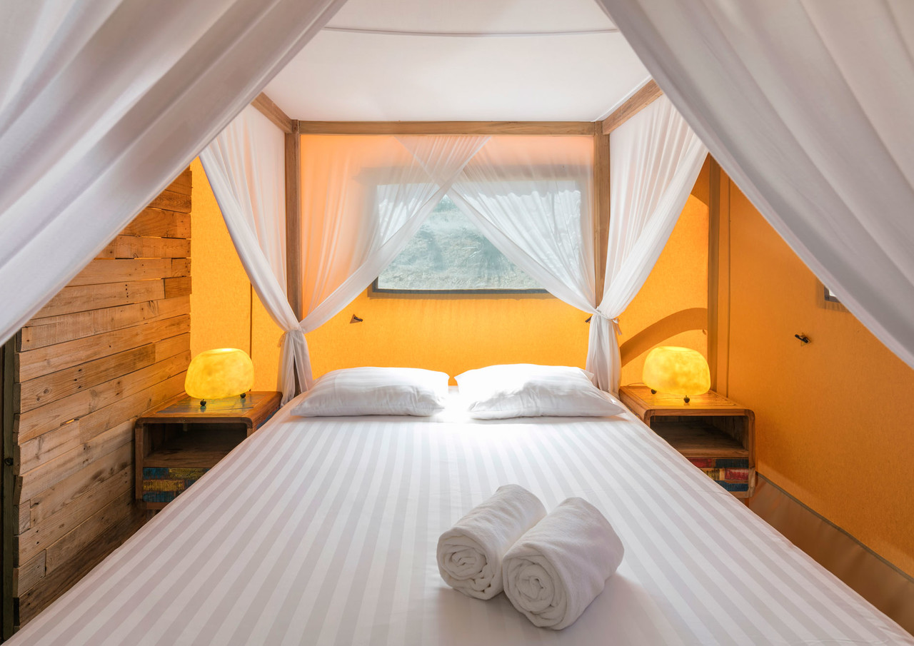 Kim foi a responsável pela decoração e pelo design do glamping, e Olivier muniu-se da experiência de ter dirigido uma empresa de construção na Bélgica para tirar o projeto do papel. O casal construiu um apartamento no edifício que já existia e juntou-lhe outros quatro. Nas imediações criou cinco tendas de campismo de luxo, sobrelevadas do chão, a lembrar um resort africano, com todo o conforto moderno.