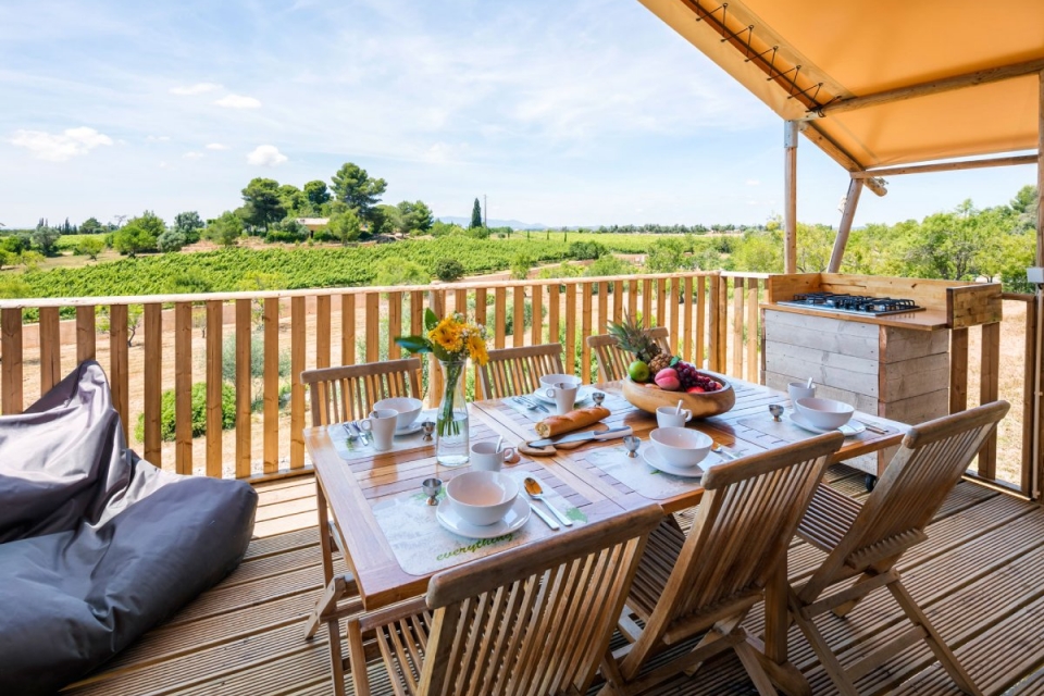 A Casa Tuia dispõe ainda de duas villas com piscinas privadas. Nos dias de calor, os hóspedes podem mergulhar na piscina rodeada de espreguiçadeiras e refrescar-se no lounge-bar. Duas vezes por semana, Olivier acende o forno a lenha e as famílias juntam-se para fazer as próprias pizas. Pingue-pongue, basquetebol ou petanca são os jogos disponíveis no glamping, equipado igualmente com um parque infantil.