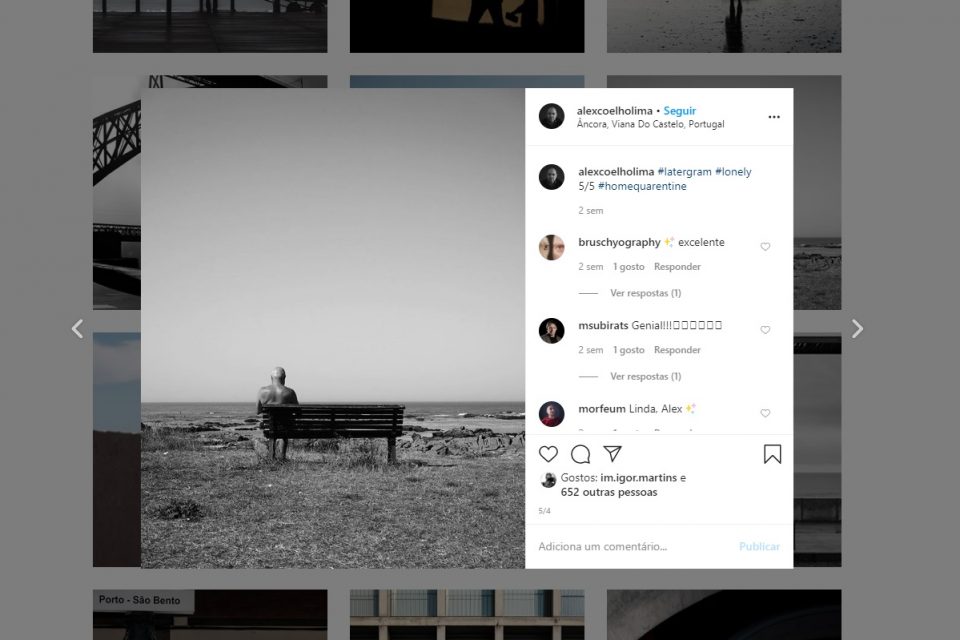 Um homem só, sentado num banco sobranceiro à praia, e o mar no horizonte é uma composição fiel aos tempos de isolamento social que se vivem. Foi com esta fotografia, tirada em Âncora, Viana do Castelo, que Alexandre Coelho Lima encerrou a série de cinco imagens com o tema “sozinho”, uma das coleções de fotografias antigas que tem publicado durante a quarentena. Jogos de sombras, perspetivas e silhuetas são alguns dos elementos mais recorrentes no trabalho do vimaranense, que gosta de explorar diferentes formas de fotografar, espelhadas num mural eclético e um tanto cinematográfico. Arquiteto de profissão, Alexandre dedica-se à lente nos tempos livres e reconhece a influência da arquitetura nas suas imagens, principalmente na forma como olha o pormenor. “Sou quase obsessivo na composição”, admite. Atrai-o a fotografia de rua, “mais desafiante”, e prefere fotografar sozinho, como numa dessas imagens em que retrata a solitude.