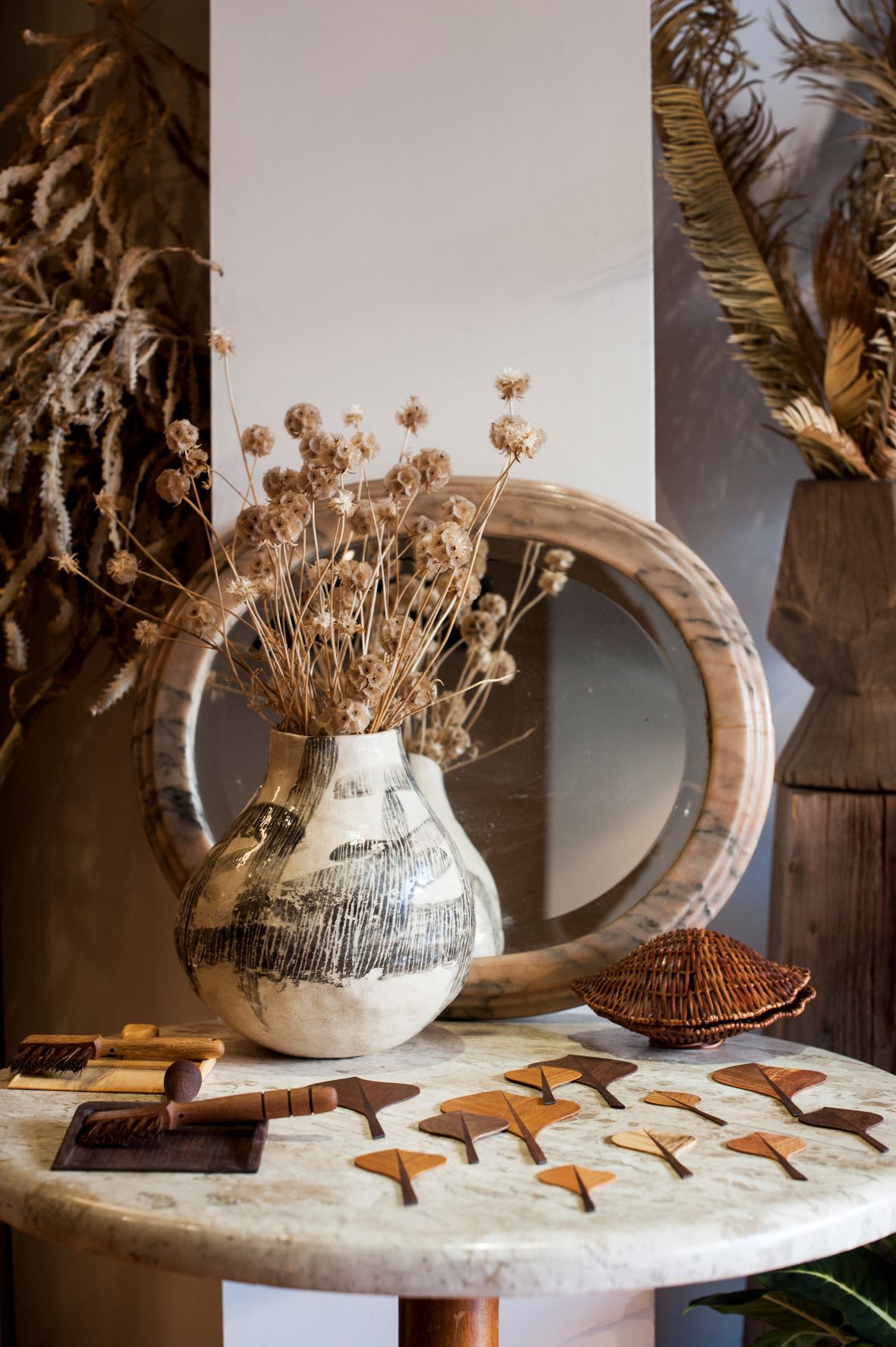 Na fachada do edifício, ainda se lê o nome Por Vocação, da loja de moda masculina que ali existiu em tempos, mas a oferta atual é bem distinta. Os arranjos de flores secas e preservadas que estiveram na base do Flórida Studio surgem lado a lado com plantas naturais, roupa e acessórios vintage, joias, têxteis, cerâmica, mobiliário, peças decorativas e outros objetos desenvolvidos por artesãos e artistas nacionais – às vezes, em parceria com a casa, resultando em artigos exclusivos.