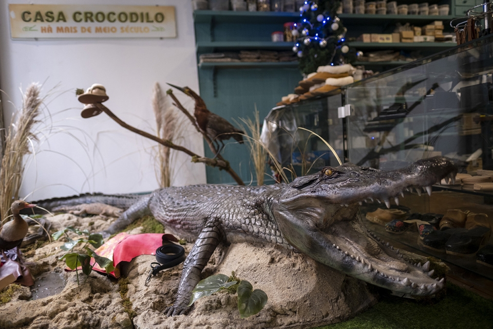 Uma montra com ares tropicais é agora o “habitat” do reparado réptil de cinco metros que passou as últimas décadas suspenso no teto da Casa Crocodilo, convivendo com couros, solas, napas e cabedais. Dar mais visibilidade ao septuagenário crocodilo foi uma das vontades de André Coutinho – neto de Tomás Coutinho, fundador da casa -, aquando das obras feitas na loja de 74 anos, graças ao programa municipal Porto de Tradição, que revitaliza e distingue negócios históricos da cidade.