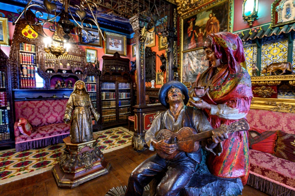 O ponto de partida é a sala regional, ou minhota, porque abundam as referências a essa região do país, dos arraiais aos corações de Viana. Seguem-se divisões como a sala de jantar, a sala de baile ou a sala azul, sem esquecer o antigo escritório de Fernando de Castro, onde está um exemplar do livro “Meteoro”, escrito em homenagem ao sobrinho que morrera ainda bebé. “Ele escreveu seis livros, entre eles ‘Altar sem culto’”, título que se pode aplicar à sua casa, comenta Ana Anjos Mântua. Afinal, abundam as estruturas vindas de espaços religiosos e adaptadas àquele lugar: talha, muita talha, e também partes de cadeirais, figuras de anjos e mártires, altares, oratórios.