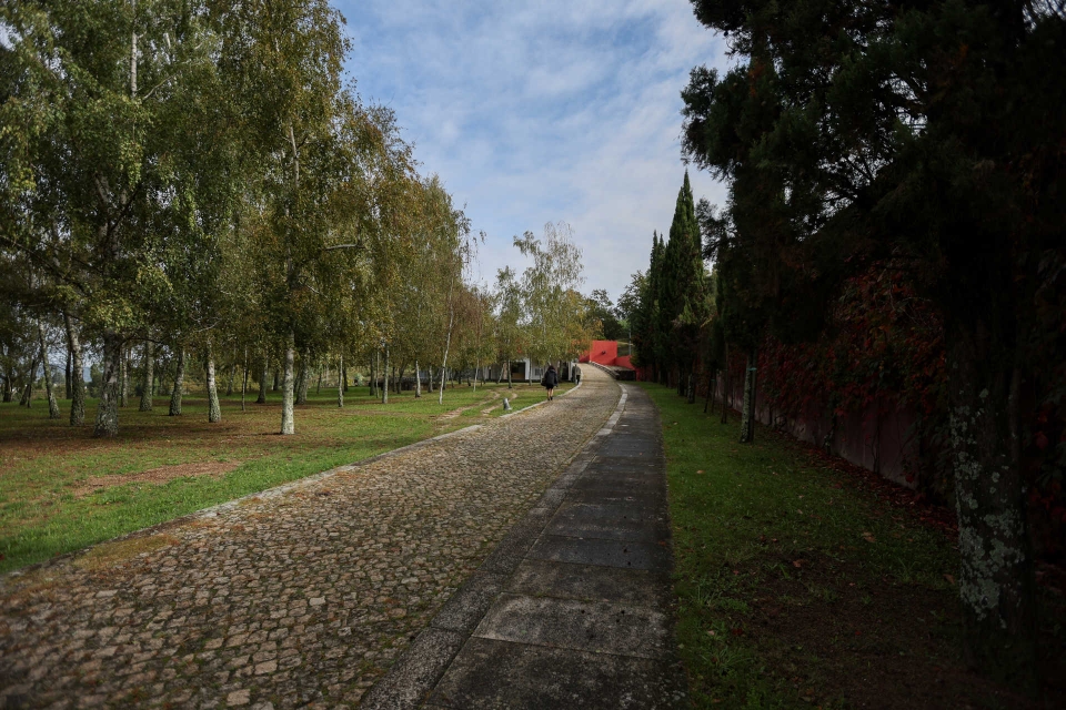 - Passando o átrio, pintado de vermelho escuro, chega-se a uma zona verde que é também um espaço cemiterial. (Fotografias de Paulo Jorge Magalhães/GI)