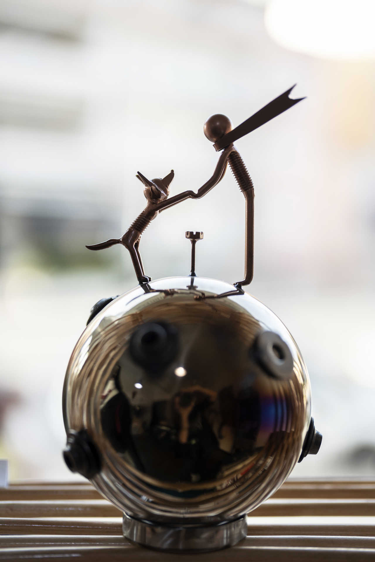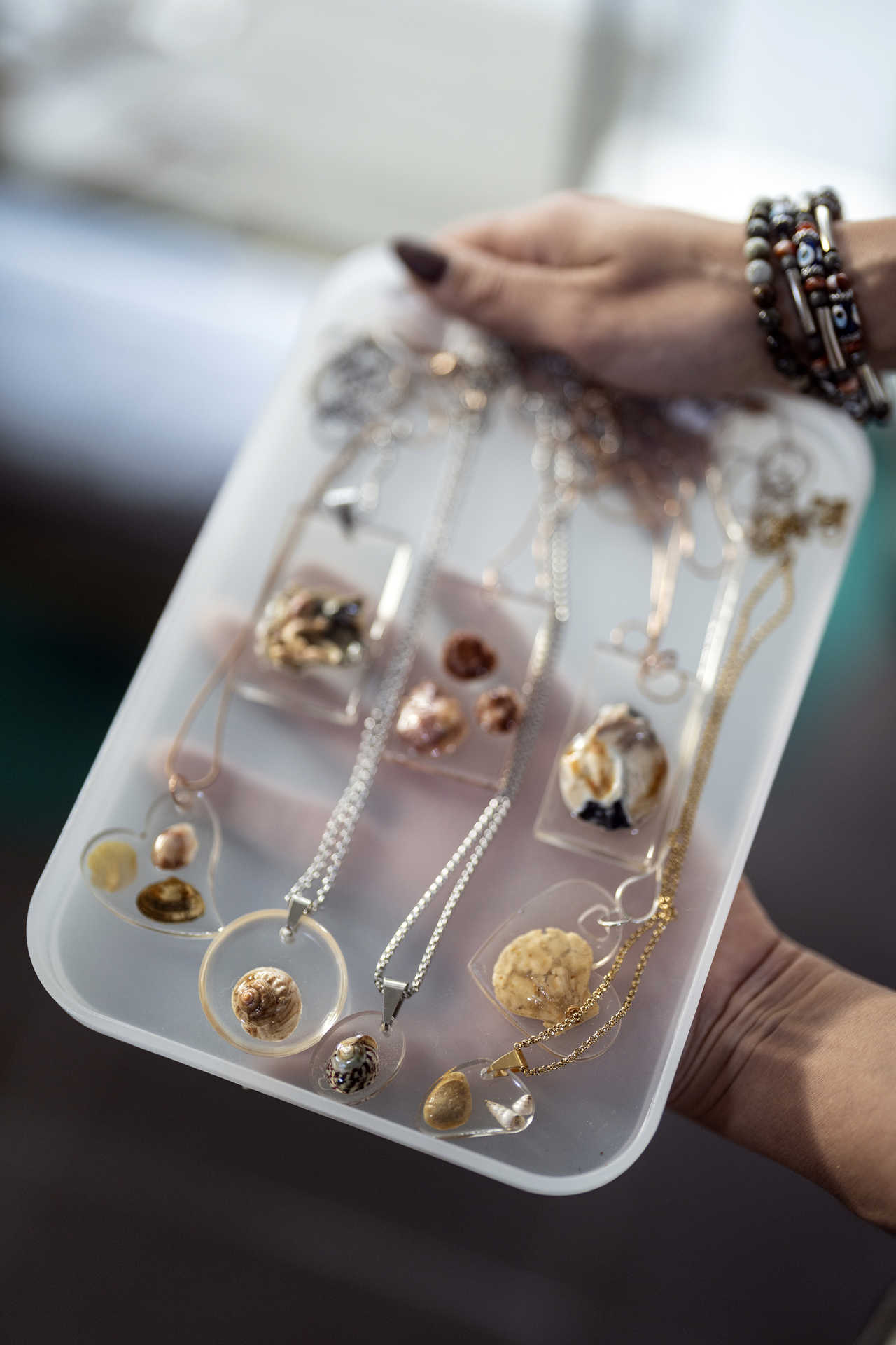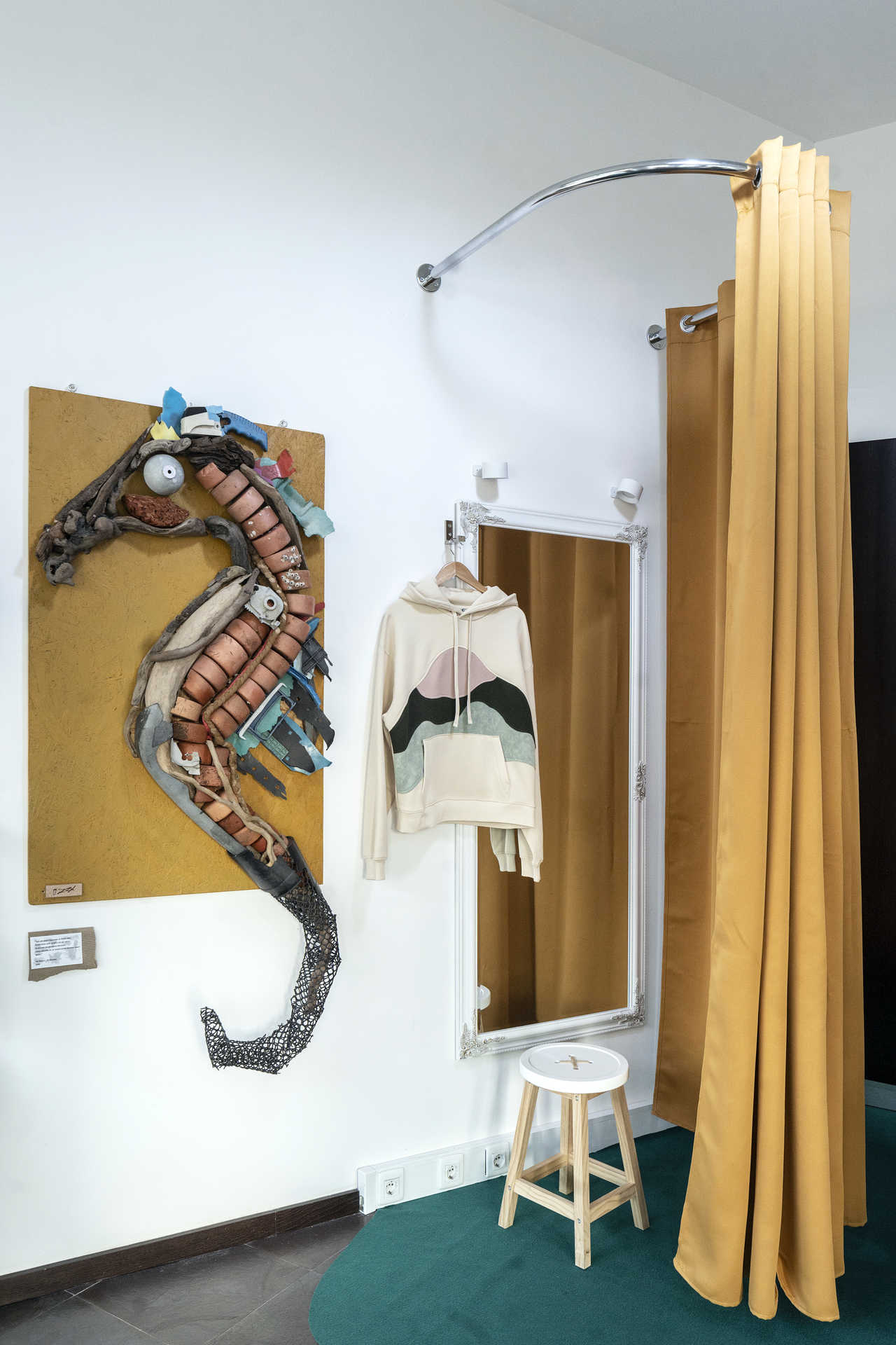 Daí que a oferta não se esgote na roupa. Por exemplo, há bijuteria feita com contas reutilizadas, e peças decorativas construídas a partir de peças de automóveis, motos e bicicletas (podem assumir a forma de Rainha Santa Isabel ou de personagens d’O Principezinho). Das paredes espreitam ainda obras de Rui Reigota, produzidas no âmbito do seu projeto Pé Descalço. Magda esclarece que ele faz limpeza em praias e outros espaços naturais e usa os resíduos recolhidos, em bruto, para criar peças como a que admiramos junto ao provador, representando um cavalo marinho.