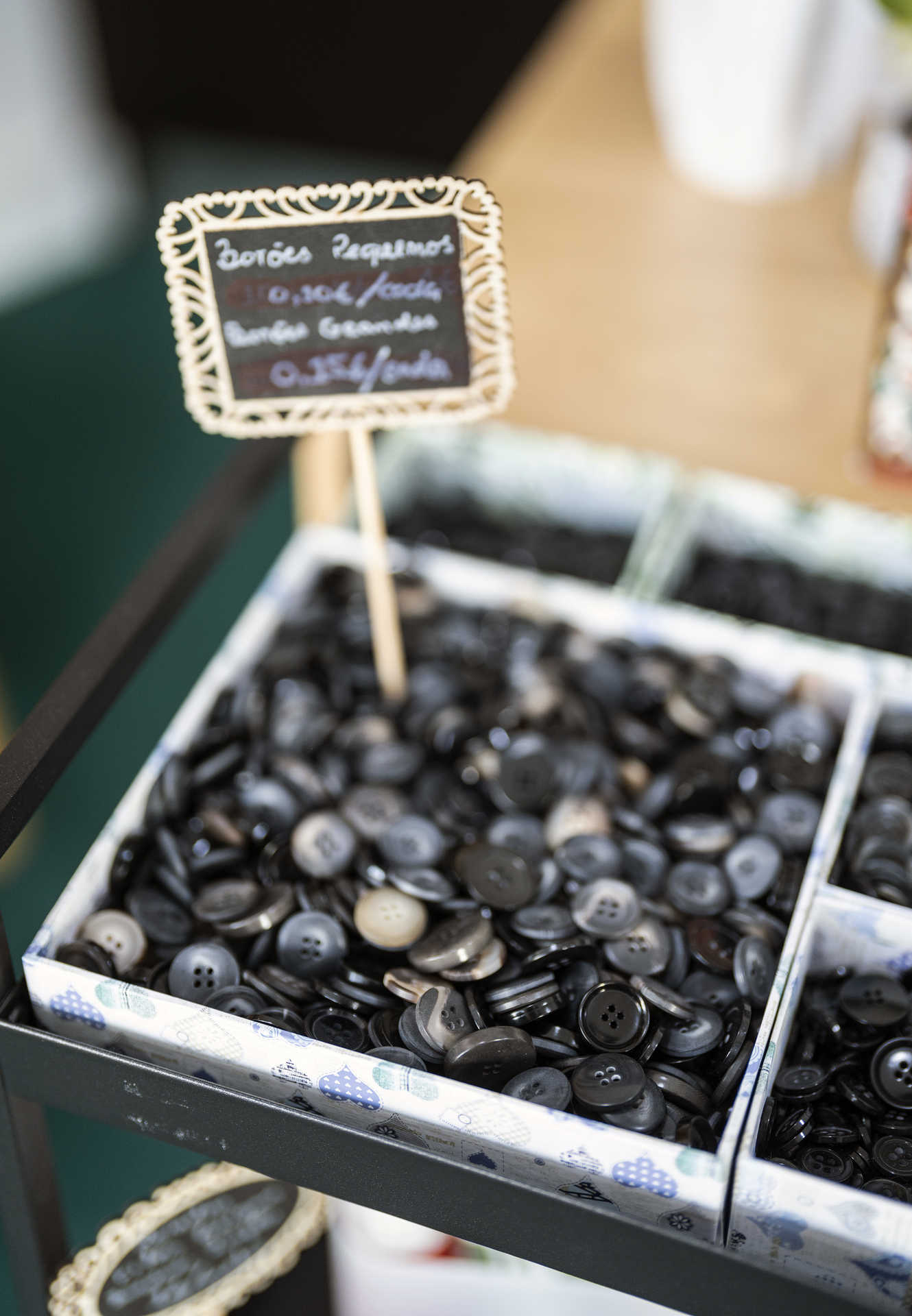 Também expostos (mas não para venda) estão uma carteira, um blusão e uma sweatshirt customizados por Luís Martins, que aceita fazer o mesmo, por encomenda, com vestuário, calçado e outros acessórios. Nesta loja, todos os detalhes contam. Veja-se, por exemplo, o cartão de visita, que pode ser lançado à terra, porque incorpora sementes de alfazema.