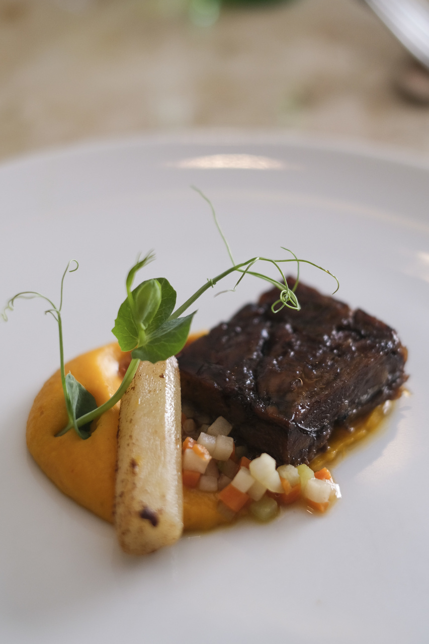 Já fora da ementa, mas pronta a ser reproduzida em casa, está esta sugestão de bochechas de porco ao vinho. À carne, junta-se puré de cenoura e batata-doce e ainda salsifi, uma raiz que pode ser substituída por cherovia, tupinambo ou mandioca – o procedimento é o mesmo, basta ajustar o tempo de cozedura. E, depois, saborear. CF
