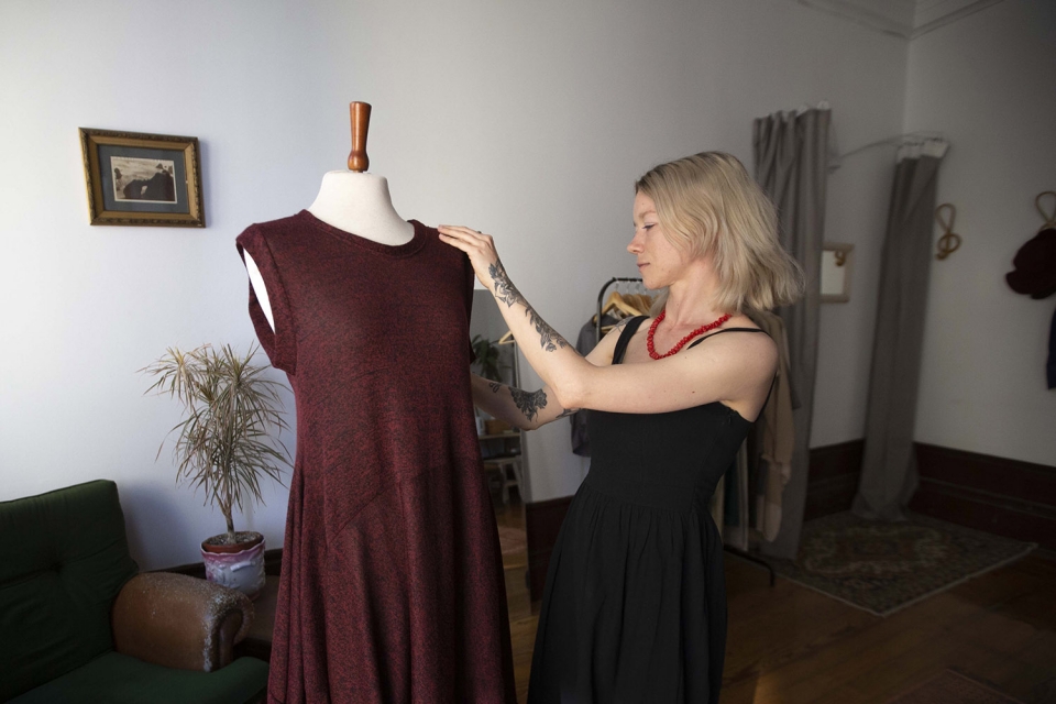Mas nunca deixou a roupa de lado. Acredita que o gosto por trabalhar os têxteis vem da avó. “Ela sempre fez bordados, tricô, croché… tínhamos uma máquina de costura para as coisas de casa. Nos inícios de 2000, não havia abundância na Ucrânia. Por isso, temos a cultura de que quando algo se estraga, arranja-se, não se deita fora”. Essa cultura do reaproveitamento espelha-se no ateliê que inaugurou em dezembro do ano passado, decorado com parco mobiliário, todo vintage, e alguns elementos repescados do lixo, como o tapete.
