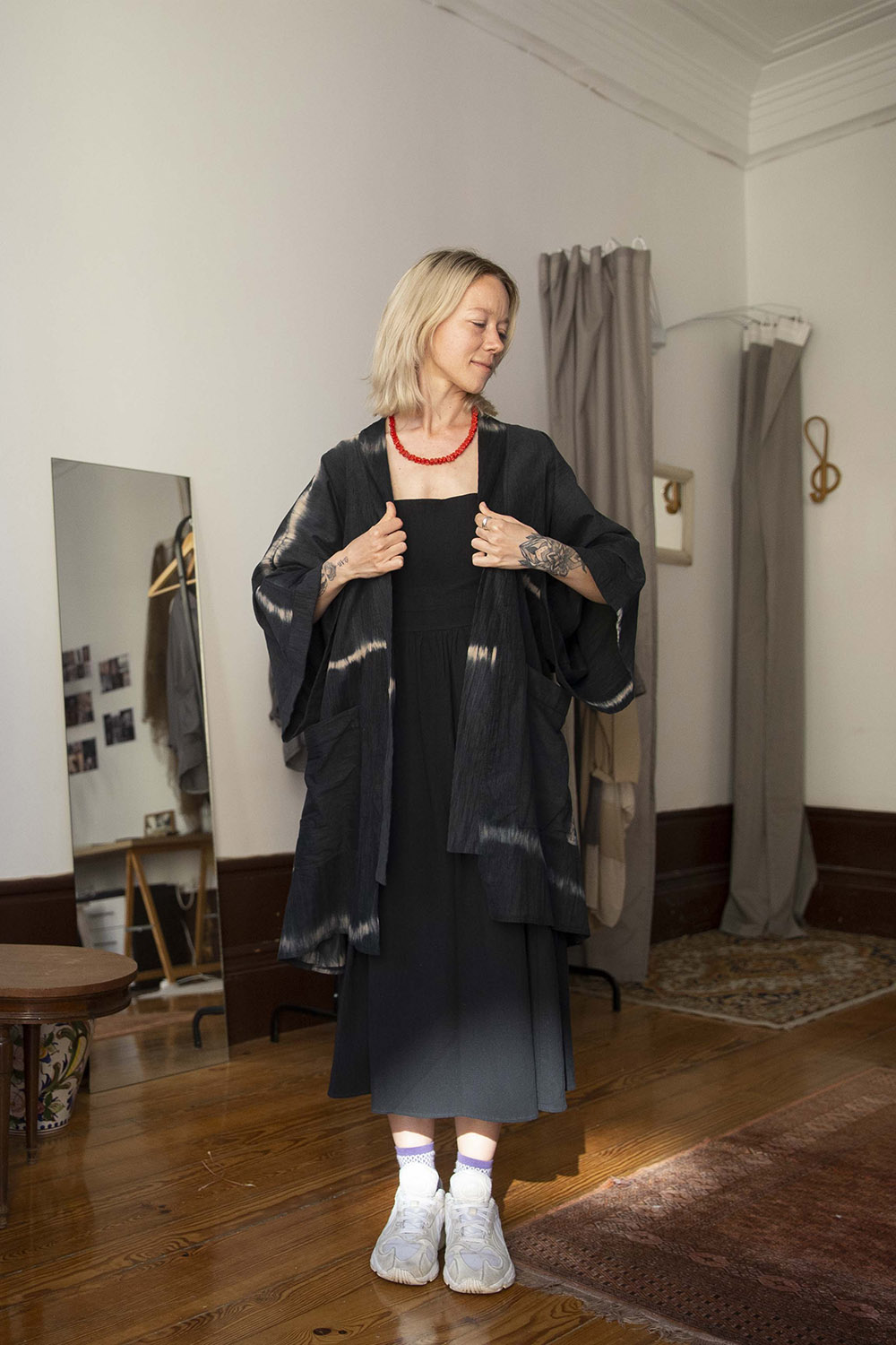 Mas nunca deixou a roupa de lado. Acredita que o gosto por trabalhar os têxteis vem da avó. “Ela sempre fez bordados, tricô, croché… tínhamos uma máquina de costura para as coisas de casa. Nos inícios de 2000, não havia abundância na Ucrânia. Por isso, temos a cultura de que quando algo se estraga, arranja-se, não se deita fora”. Essa cultura do reaproveitamento espelha-se no ateliê que inaugurou em dezembro do ano passado, decorado com parco mobiliário, todo vintage, e alguns elementos repescados do lixo, como o tapete.