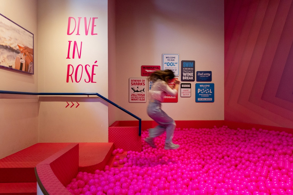 A viagem segue para Portugal, com a história e a prova do mais afamado rosé português – o Mateus Rosé -, que até às mãos de Jimi Hendrix a garrafa em forma de cantil chegou, como comprova uma fotografia a preto e branco. Continuando a visita chegamos à sala da já mencionada piscina de bolas – a remeter para o ambiente veranil e descontraído associado a este tipo de vinho -, e ao lado de um piquenique de “pernas para o ar”, prova-se o clarinho espumante Vértice Douro DOC Rosé, muito fresco e volumoso.
