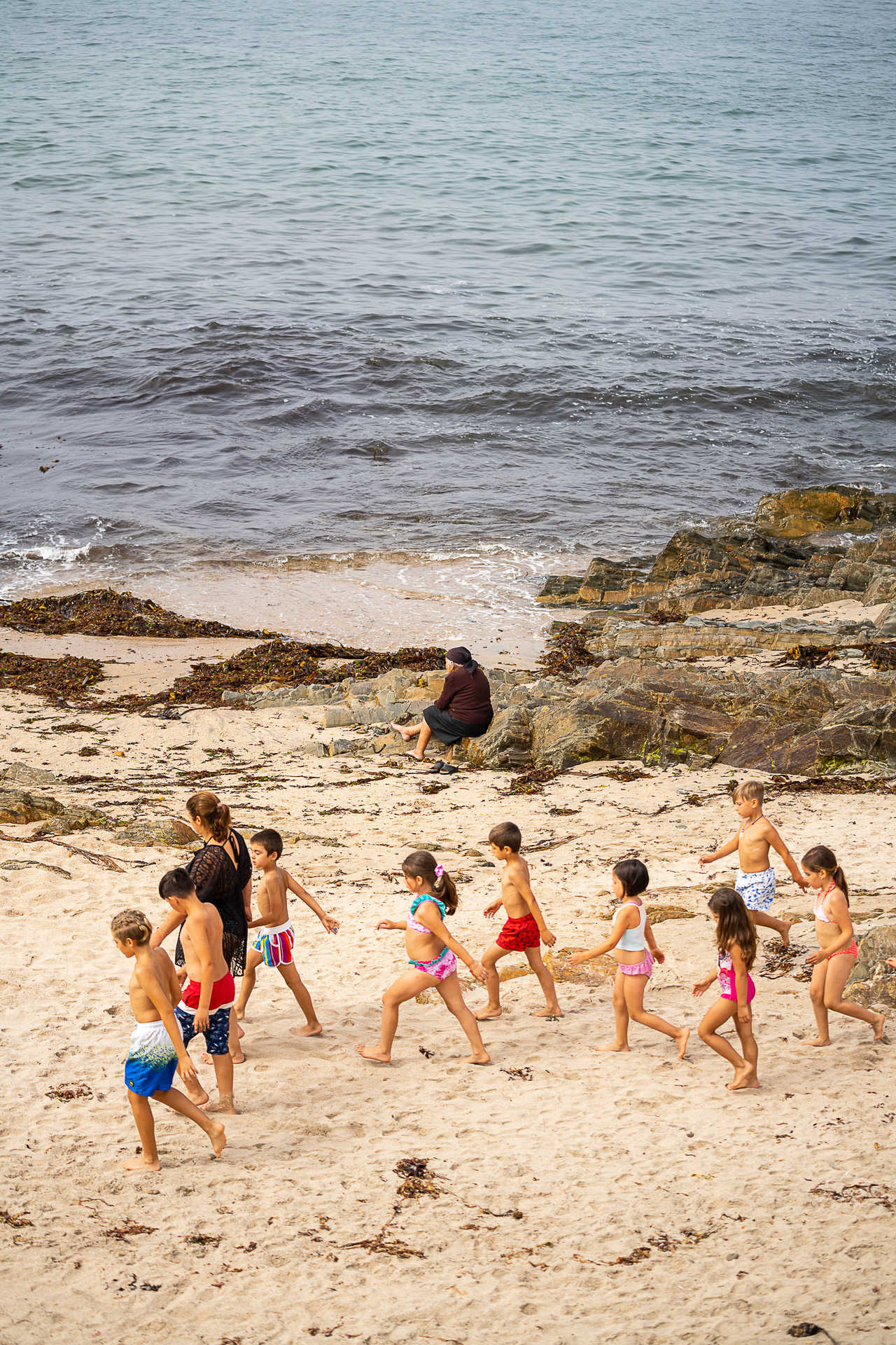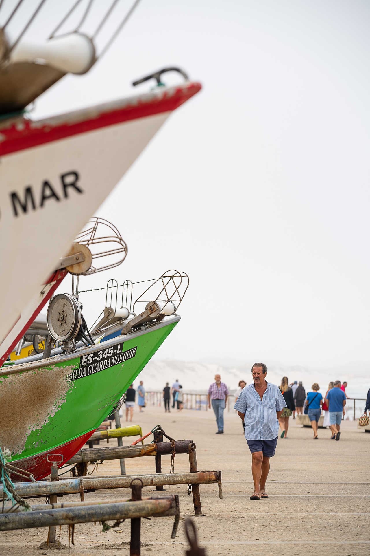 Uma mulher vestida de negro, de lenço amarrado na cabeça, está sentada, em silêncio, sozinha, numa rocha à beira do mar, com os pés metidos na areia e no sargaço da praia da Apúlia, em Esposende. Alguns metros ao largo, no areal, passa um bando interminável de crianças vestidas com t-shirts e chapéus coloridos. Correm, brincam umas com as outras e os seus gritos e riso solto ouvem-se à distância. À volta, tanto para norte como para sul, a praia está cheia. Sobretudo nas zonas onde não há ou amainam os afloramentos rochosos, as pessoas amontoam-se (“parece o Rio de Janeiro”, observa alguém). Barracas de tecido às riscas azuis e brancas, muitas delas desbotadas pela passagem do tempo, alinham-se em longas filas pelo areal fora. E no paredão, gente de todas as idades passeia ou conversa de pé ou sentada. Uma mulher pára a falar com outra e parece argumentar contra alguém que se recusou vir à praia. “Então, o mar nas pernas não faz bem?”, atira.