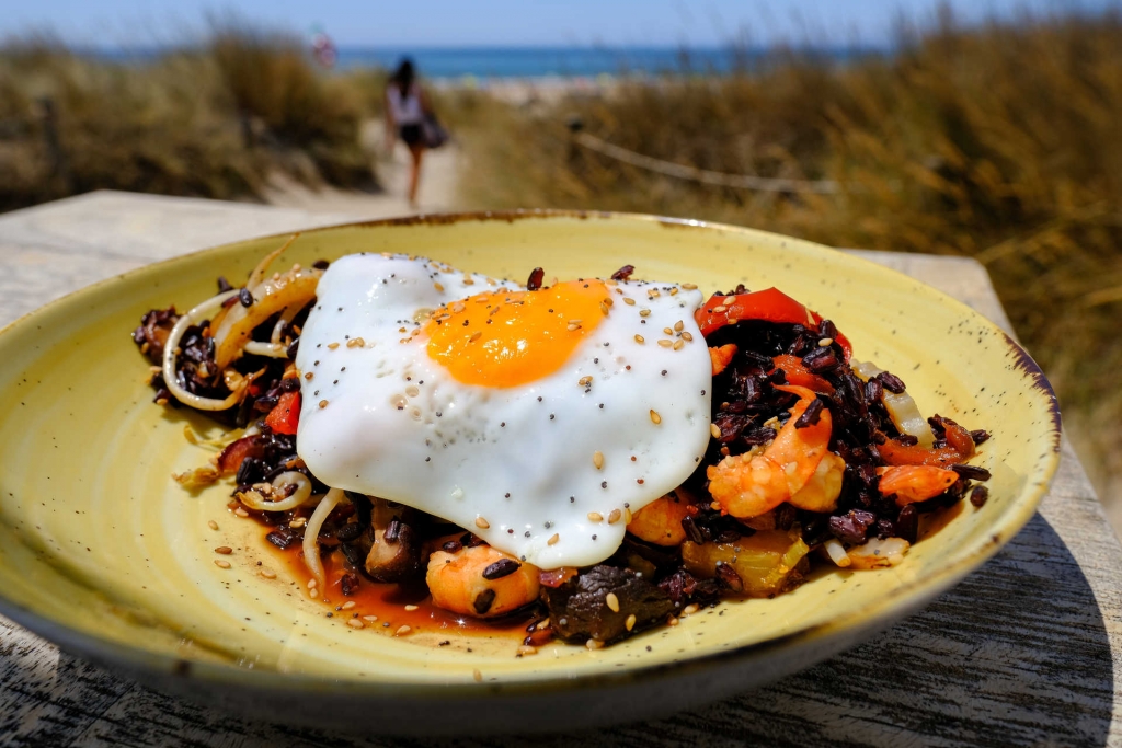 Entre os extremos norte (Cova do Vapor) e sul (Fonte da Telha), multiplicam-se os restaurantes e bares de praia, quase todos debruçados sobre as dunas. Por estes dias, no Lorosae, em São João da Caparica – um retiro de madeira com esplanadas arejadas e uma zona de pés na areia – há uma nova carta de verão com tacos de atum, de camarão e de pá de porco; tataki de atum com quinoa; e uma salada vegan, entre outros sabores refrescados com sumos naturais, sangrias e cocktails.