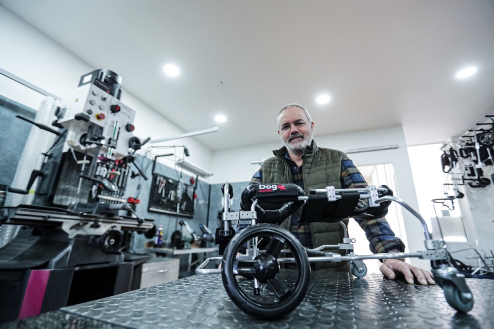Tudo começou quando o seu cão Benny ficou com os membros posteriores paralisados, na sequência de uma queda. Nem a cirurgia nem a fisioterapia deram resultado, logo, a solução passava por uma espécie de cadeira de rodas. Encontrou algumas opções no estrangeiro, mas entendeu que o assunto não devia ser tratado à distância, por isso, decidiu construir ele mesmo o equipamento para Benny. “Foi um equipamento extremamente arcaico. Mas o suficiente, com todas as limitações, para o pôr a andar”, recorda.