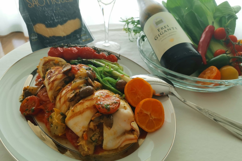 Rechear a lula e levá-la a grelhar. De seguida, levar a lula cerca de 10 a 15 minutos ao forno. Tirar do forno e servir com os legumes salteados e o molho no topo da lula. Pode-se finalizar com um bocado de queijo Ilha de São Miguel 9 meses ralado por cima da lula. Acompanhar também com pequenas fatias de queijo.