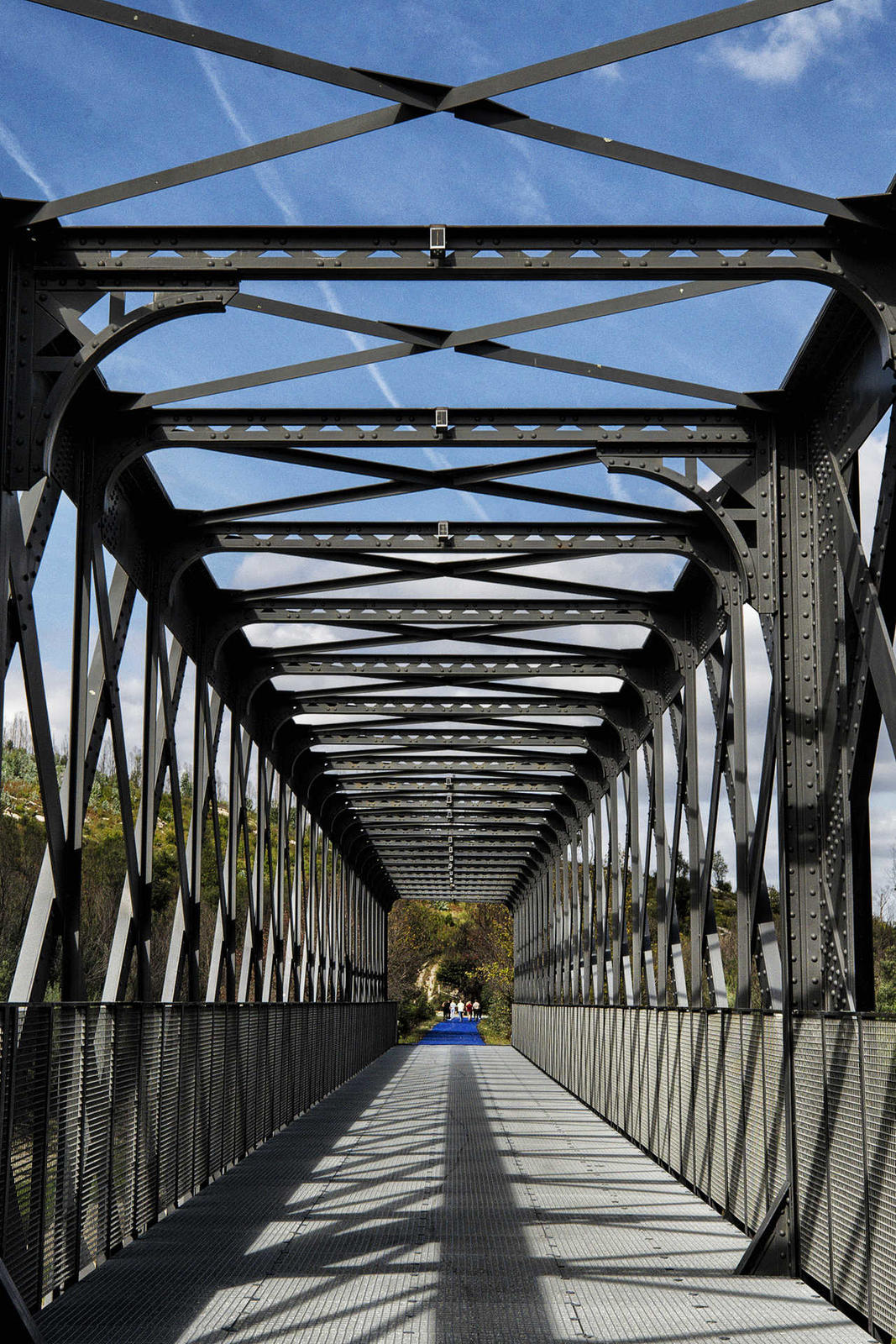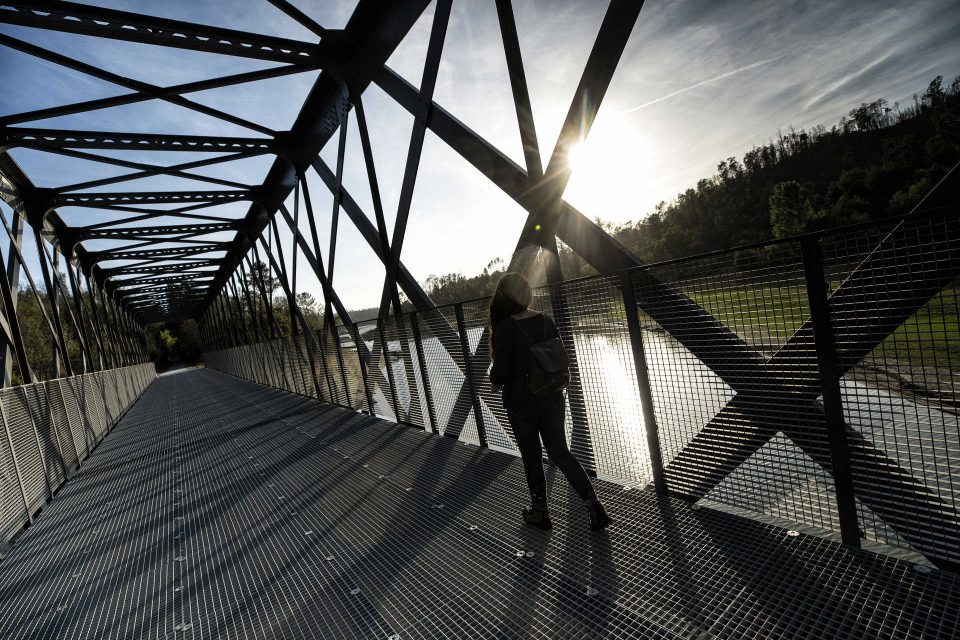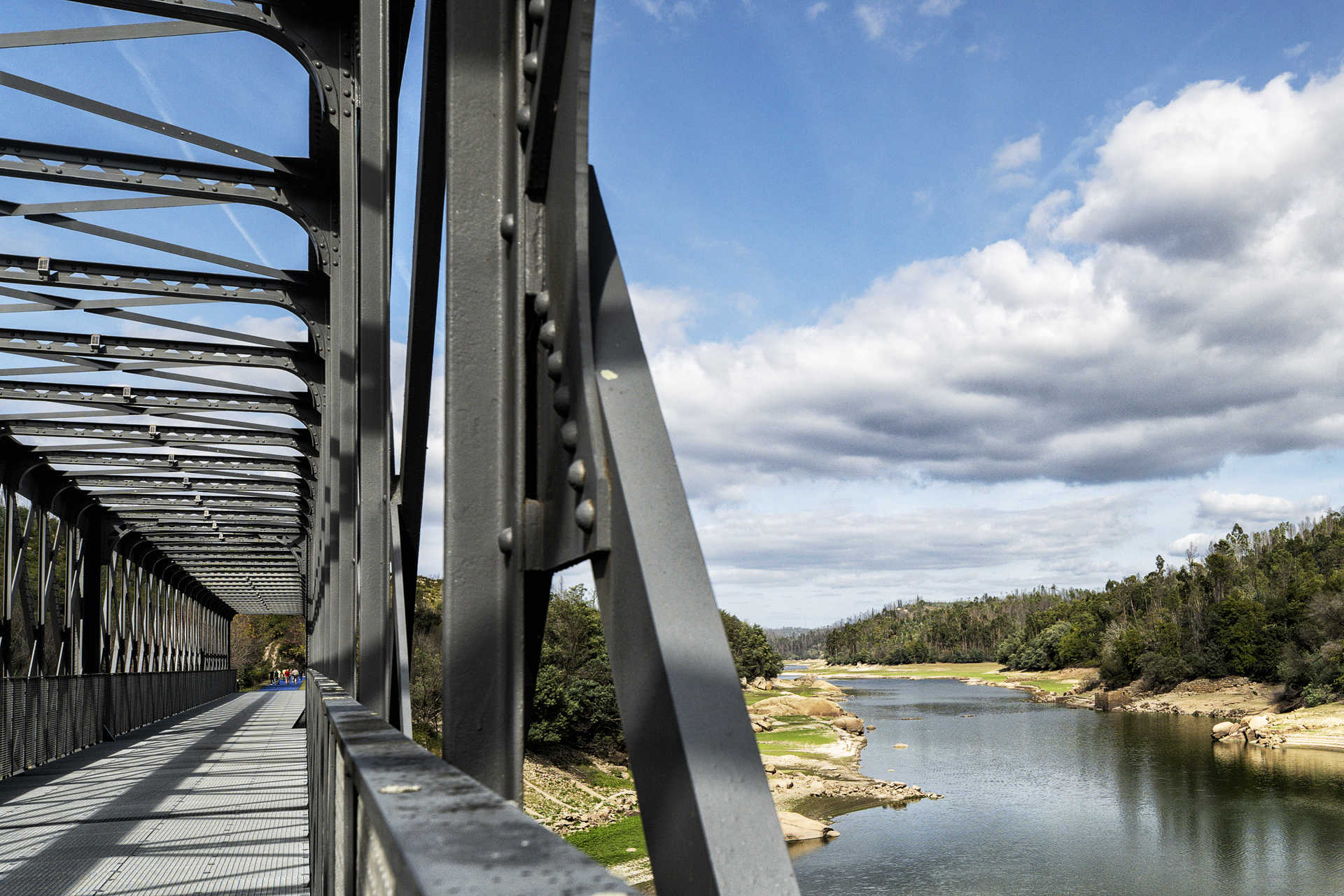 Por um bom bocado o rio mostra-se tímido, e só se deixa ver com fartura à chegada da ponte metálica que o atravessa, o ponto alto do percurso. Um tabuleiro crivado que deixa ver o manto de água lá no fundo.