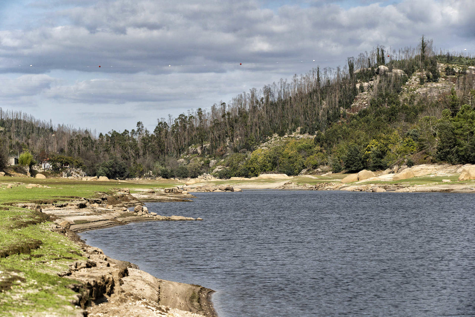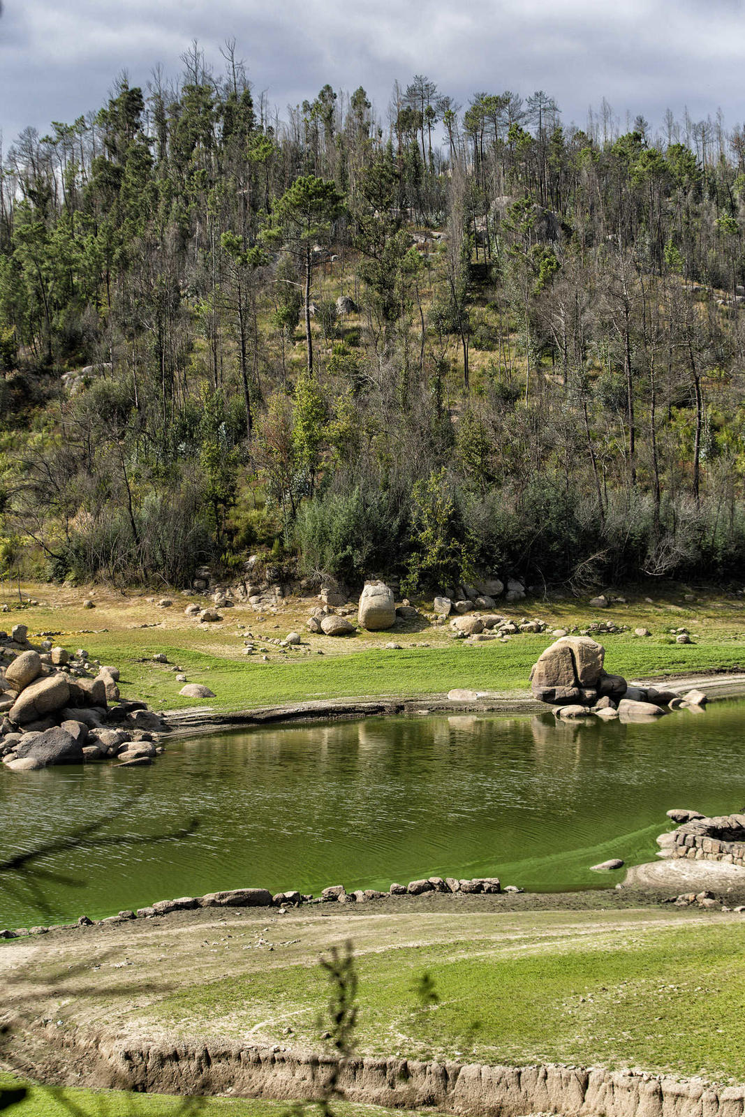 A partir dali o caminho continua no lado direito do Dão. Contam-se já quatro quilómetros de passeio. A paisagem começa a ser pincelada por zonas de área ardida e nas margens do rio distinguem-se grandes penedos encavalitados.
