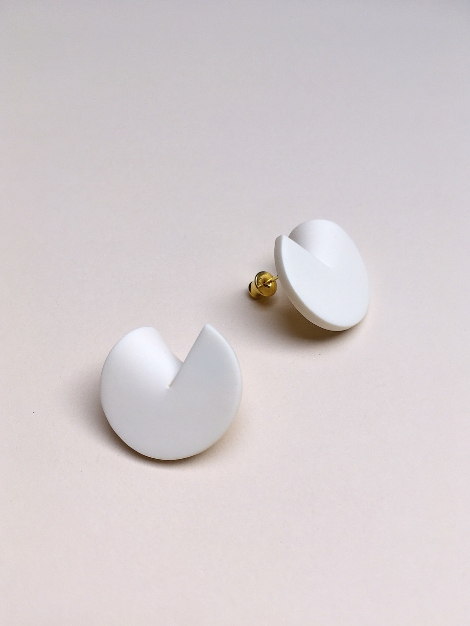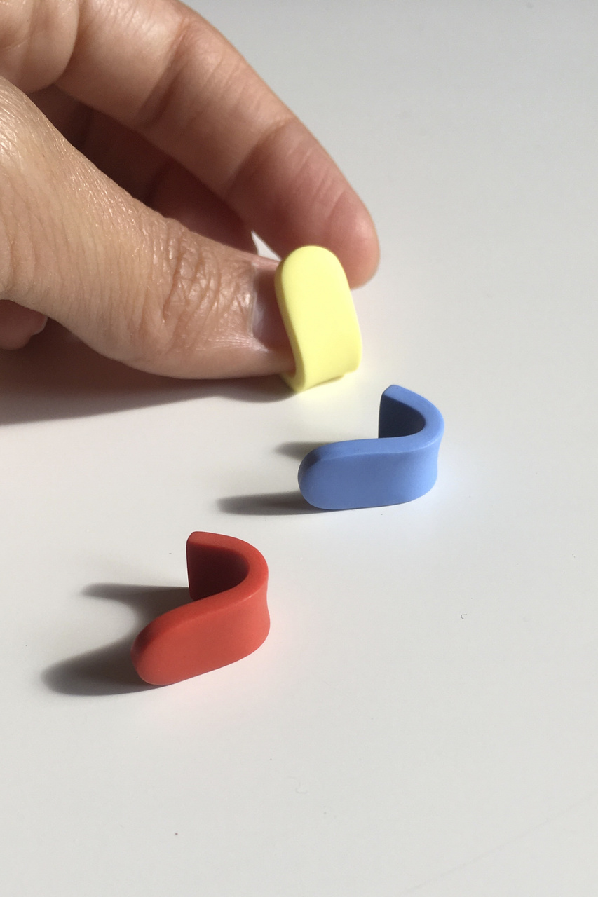 Ao procurar materiais para moldar, Rita chegou à massa polímera, uma espécie de plasticina que vai ao forno e solidifica, adquirindo grande resistência (uma das marcas mais conhecidas, cá, é a alemã Fimo). Assumiu-a como matéria-prima principal quando percebeu que permitia “fazer peças de aspeto impecável e requintado” e obter tons únicos, como se estivesse a misturar tintas partindo das cores base. Para despistar eventuais alergias e manter a elegância, a parte de trás dos brincos é de prata banhada a ouro, e utiliza uma técnica que dispensa o uso de cola. “Sempre fui apologista de criar objetos para durar”, justifica.