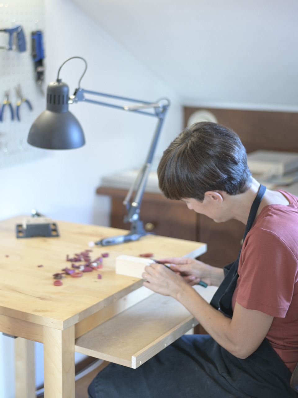 Rita Botelho regressou a Portugal após uma década lá fora. Viveu em Itália, no Japão, na Suíça e na Alemanha e, há pouco mais de um ano, mudou-se para o Porto, onde criou a marca de joalharia Piino. A cor é determinante neste projeto, que, para já, só contempla brincos feitos à mão, com tons criados também por si. Desenvolveu o gosto pelo artesanato ao observar, fascinada, as peças dos artesãos japoneses, altamente perfecionistas. Ela, que tem uma licenciatura em Design de Equipamento e fez um mestrado ligado ao artesanato português, no estrangeiro, trabalhou durante anos com empresas de joalharia; quando decidiu fazer algo seu, quis que fosse diferente do convencional, contemporâneo, colorido e, ao mesmo tempo, mate.