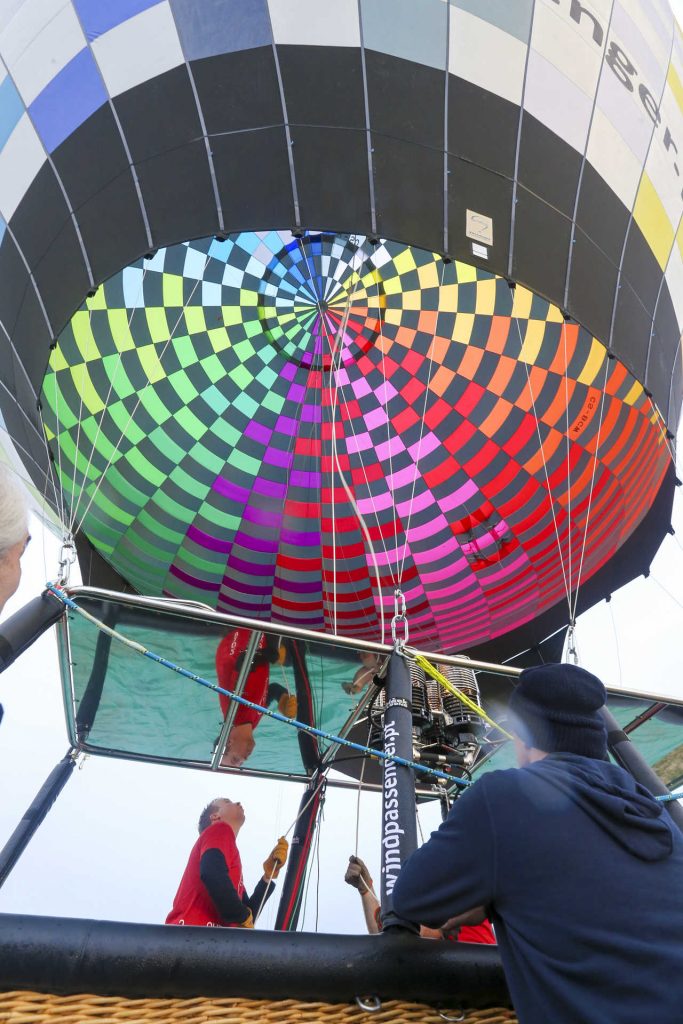 O balão de ar quente demorou quase uma hora a ser insuflado até ficar na vertical. “Ele é tão grande que precisamos de dar tempo para entrar primeiro o ar frio [com recurso a uma ventoinha] e depois o ar quente”, explica Carol. O ar quente é libertado através de queimadores, um sistema alimentado a gás propano e que, através de uma pequena pega, permite ao piloto controlar a altitude da aeronave.