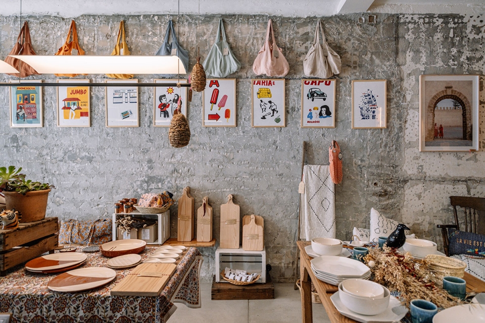 No espaço que acolheu a livraria Gato Vadio – e, antes disso, uma peixaria, da qual Joana preservou alguns azulejos, bem como o piso elevado onde instalou um balcão baseado naquele que viu num bar em Berlim -, descobre-se agora uma seleção de marcas “com sentido de humor, produzidas com matérias orgânicas e com produções pequenas”. São exemplo as cerâmicas da Casa Cubista e do Laboratório d’Estórias, o vestuário para homem da La Paz, as kanthas indianas (mantas), as serigrafias, os produtos de higiene com expressões provocatórias da The Gift Label e as peças em mármore da Stoned.