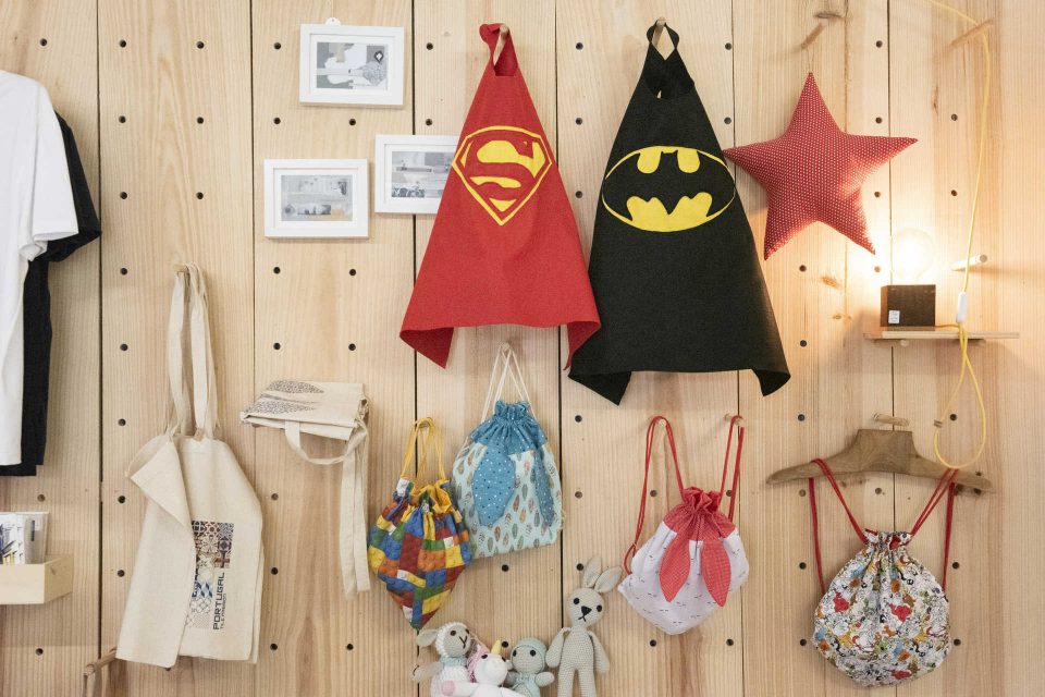 Para um público mais novo sugerem-se os bonecos em crochet com materiais inócuos para o caso de irem parar à boca e as peças de Inês. A máquina de costura Oliva pousada no balcão não deixa margem para dúvidas, foi mesmo ali que as capas de super-heróis e as mochilas em tecido foram confecionadas.