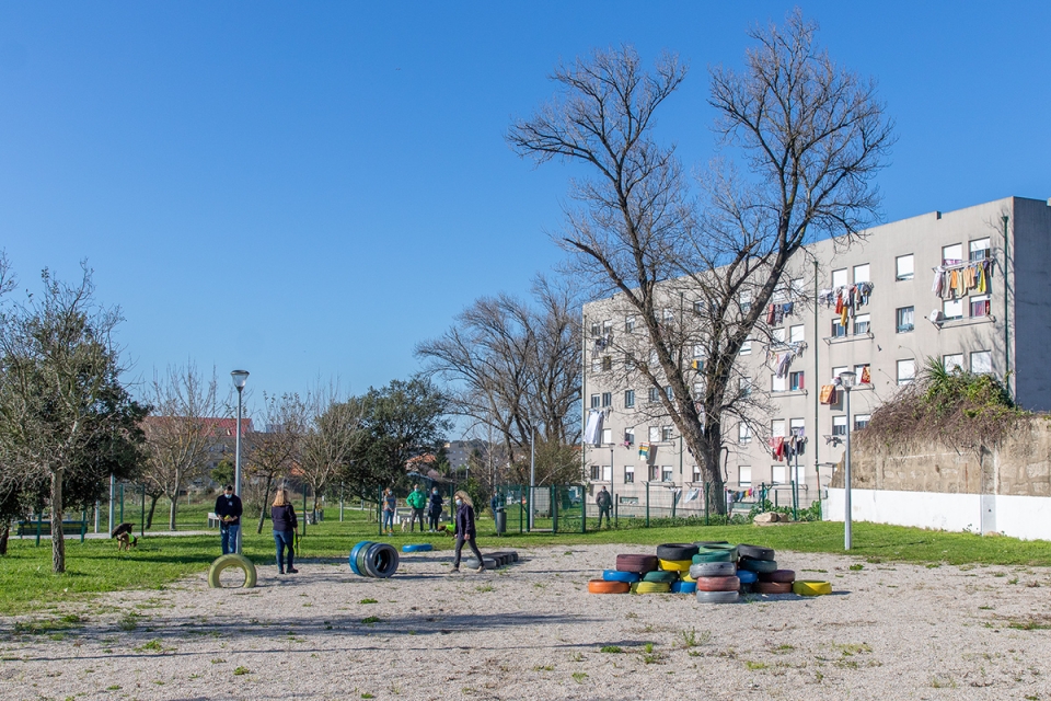 Os cães podem correr livremente numa zona verdade e brincar nos pneus reciclados.(Fotografia: Câmara Municipal de Matosinhos)