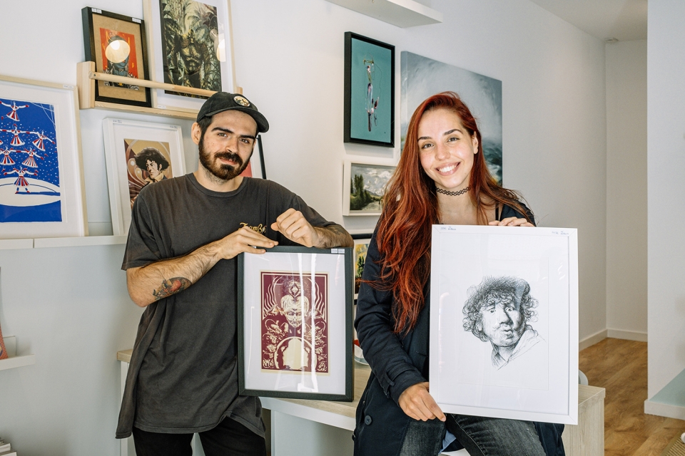 Se hoje há, no quarteirão das artes, uma galeria chamada Colectivo Besta, deve-se, em parte, à pandemia e às caminhadas que Ana Freitas e Rodrigo Rosas faziam para espairecer. Nessas ocasiões, os dois amigos e vizinhos – ela com 27 anos, ele com 25 – falavam “do sonho de ser artista e conseguir fazer dinheiro com isso”, enquanto se debatiam com a falta de trabalho e a precariedade. Um foi puxando pelo outro, até que decidiram avançar com um projeto próprio, que funciona essencialmente como loja de arte, de portas abertas, na Rua do Rosário, desde 31 de julho.