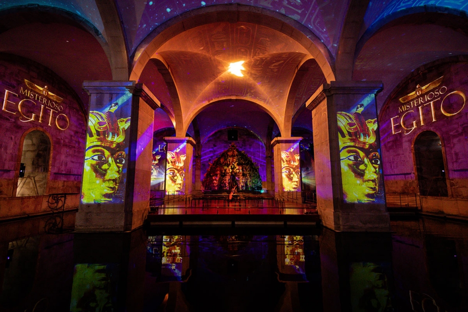 Trata-se de uma “viagem audiovisual criada a partir de conteúdos originais presentes em vários museus e bibliotecas mundiais” e que recua até há três mil anos, lê-se no website oficial do evento. As estátuas de Anúbis, o trabalho agrícola e as construções imponentes no deserto são alguns dos elementos que surgem projetados nas paredes, tetos e espelho de água daquela galeria, ao ritmo de uma banda-sonora instrumental.
