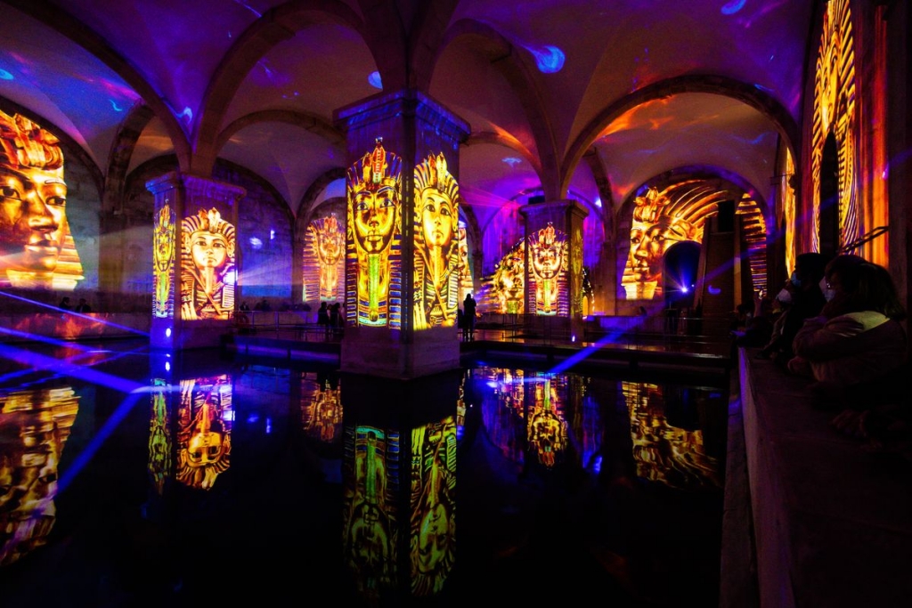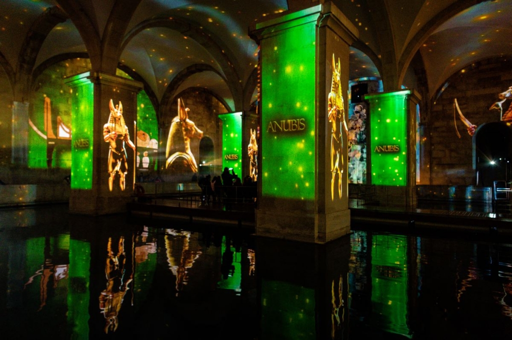 Trata-se de uma “viagem audiovisual criada a partir de conteúdos originais presentes em vários museus e bibliotecas mundiais” e que recua até há três mil anos, lê-se no website oficial do evento. As estátuas de Anúbis, o trabalho agrícola e as construções imponentes no deserto são alguns dos elementos que surgem projetados nas paredes, tetos e espelho de água daquela galeria, ao ritmo de uma banda-sonora instrumental.