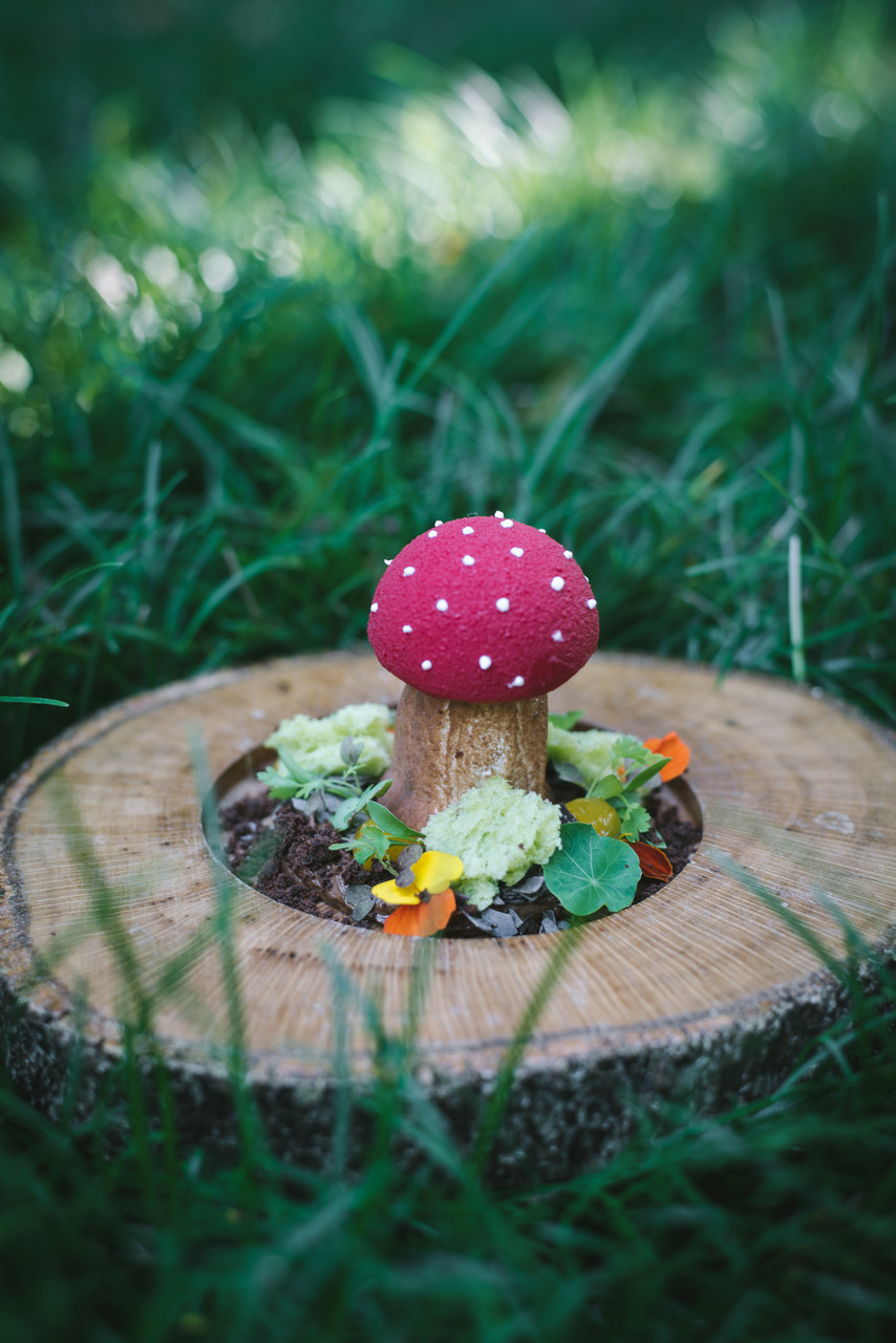 - O chef Vítor Dias, com o naco de Angus, e uma das sobremesas do livro: a floresta doce. (Fotografias: Inês Mendes/DR)
