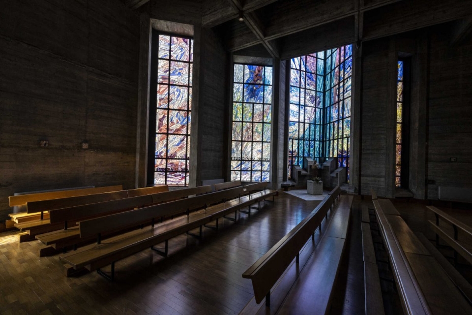 “Esta igreja não tem ponta de distração, é tudo muito limpinho. Tem só o essencial e é muito funcional”, elogia Feliciano Garcês, enquanto mostra o espaço, na companhia de Carlos Coelho, engenheiro que esteve ligado à construção da paróquia, por fases. “A grande virtuosidade é a luz natural e a ornamentação”, refere ainda, apontando os vitrais coloridos do mestre Júlio Resende, autor de diversas obras expostas – das peças de cerâmica que representam a via-sacra à imagem de Cristo no batistério (uma das zonas por onde irrompe a claridade diurna, dispensando o recurso à luz artificial), sem esquecer o tapete que conduz ao altar.