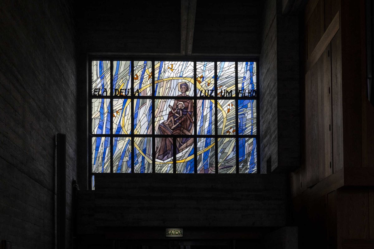 “Esta igreja não tem ponta de distração, é tudo muito limpinho. Tem só o essencial e é muito funcional”, elogia Feliciano Garcês, enquanto mostra o espaço, na companhia de Carlos Coelho, engenheiro que esteve ligado à construção da paróquia, por fases. “A grande virtuosidade é a luz natural e a ornamentação”, refere ainda, apontando os vitrais coloridos do mestre Júlio Resende, autor de diversas obras expostas – das peças de cerâmica que representam a via-sacra à imagem de Cristo no batistério (uma das zonas por onde irrompe a claridade diurna, dispensando o recurso à luz artificial), sem esquecer o tapete que conduz ao altar.