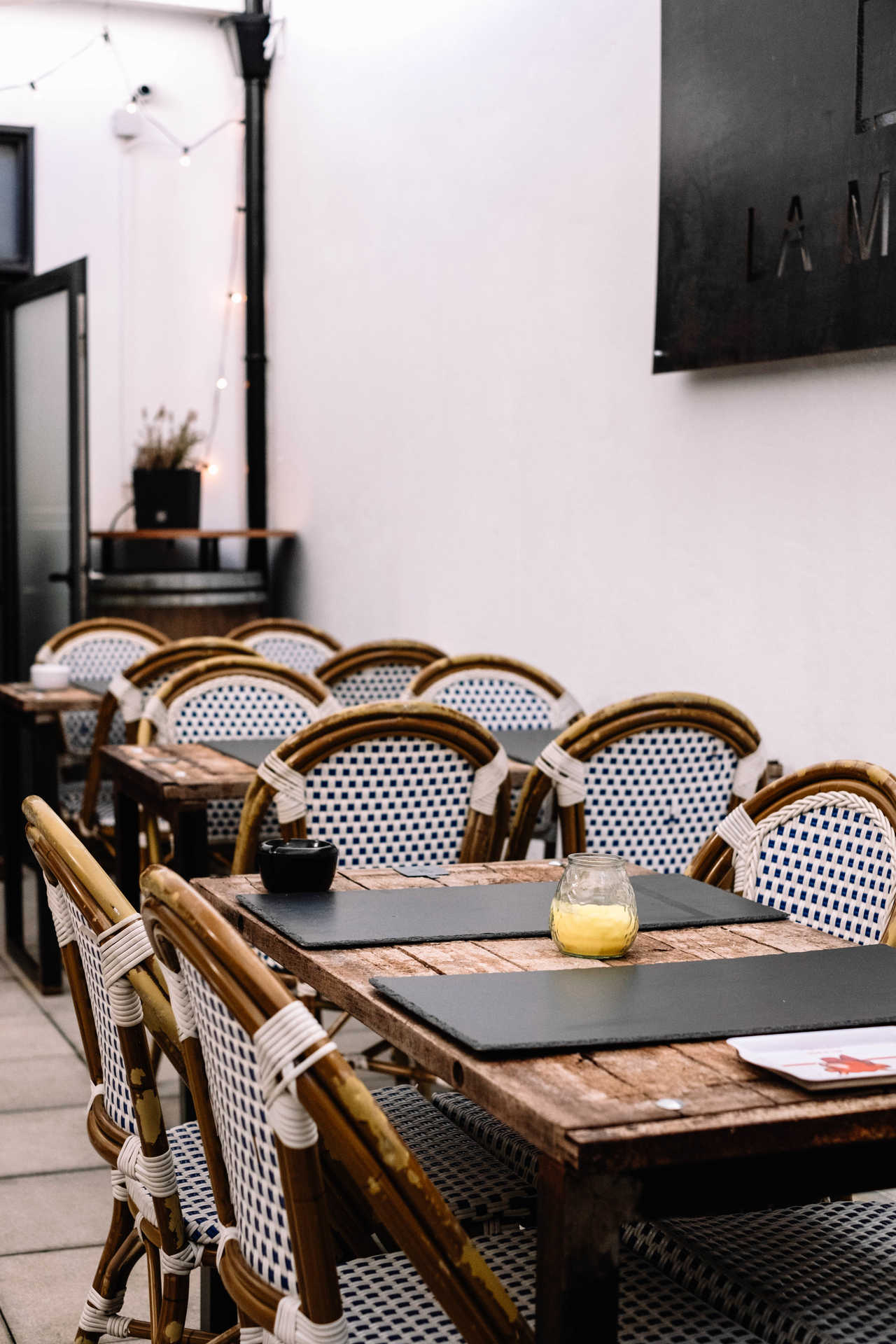 Escondido nas traseiras da recente La Maison está talvez a maior surpresa da casa, um agradável pátio, onde se provam alguns dos produtos da loja, antes de comprar. Há tábuas de queijos, sempre acompanhados por compota de figo, manteiga artesanal, fruta fresca e pão. E também de terrines. Para juntar os dois há que pedir A Francesa, (a tábua que combina queijos e terrines). E para regar tudo sugere-se um copo de vinho do momento – todos os meses muda para dar a conhecer as várias quintas representadas na garrafeira -, ou uma garrafa à escolha. É um recanto fresco e acolhedor, onde apetece estar.