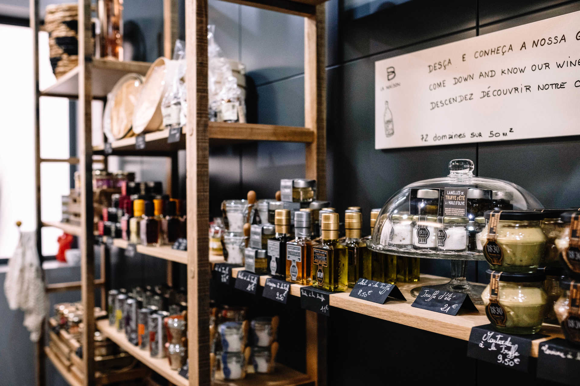 Por isso, ainda que não em exclusivo, a maioria dos produtos são provenientes da região sul do país. Como os bombons artesanais, que preenchem as prateleiras ao fundo da loja, numa zona reservada à mercearia gourmet, ao lado de terrines de javali, ganso, pato e codorniz, foie gras, compotas, vinagre de framboesa, mostarda com trufa, biscoitos. Tudo de confeção artesanal.