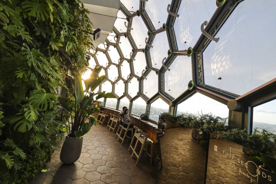 O interior da cúpula da Vasco da Gama Tower Babylon 360º lembra um favo de mel. Há neons que mudam de cor, um jardim vertical de plantas naturais, sofás e bancos altos debruçados sobre a vista panorâmica. Para ajudar a descodificar a paisagem, mas também a divulgar a história, natureza e património do país, cada uma das 38 janelas do miradouro tem um ícone e um QR code com textos breves audiodescritos sobre o centro histórico de Lisboa, os Açores, o Atlântico, o Oceanário, entre outros.