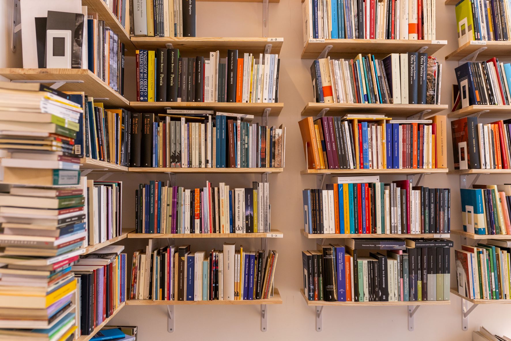O novo espaço, cedido pela autarquia, está a ser organizado aos poucos. “Quando começámos a mudança, percebemos que, apesar de maior, não tínhamos estantes suficientes para todos os livros. Lá, como era pequeno, os livros estavam arrumados até ao chão”, conta. Agora, o trabalho e curso consiste em reorganizar, e começar a fazer novos pedidos. O foco continua a ser a poesia e o teatro, mas também há ficção, biografias, diários, cartas, ensaios sobre cinema, dança, género, entre outros assuntos.