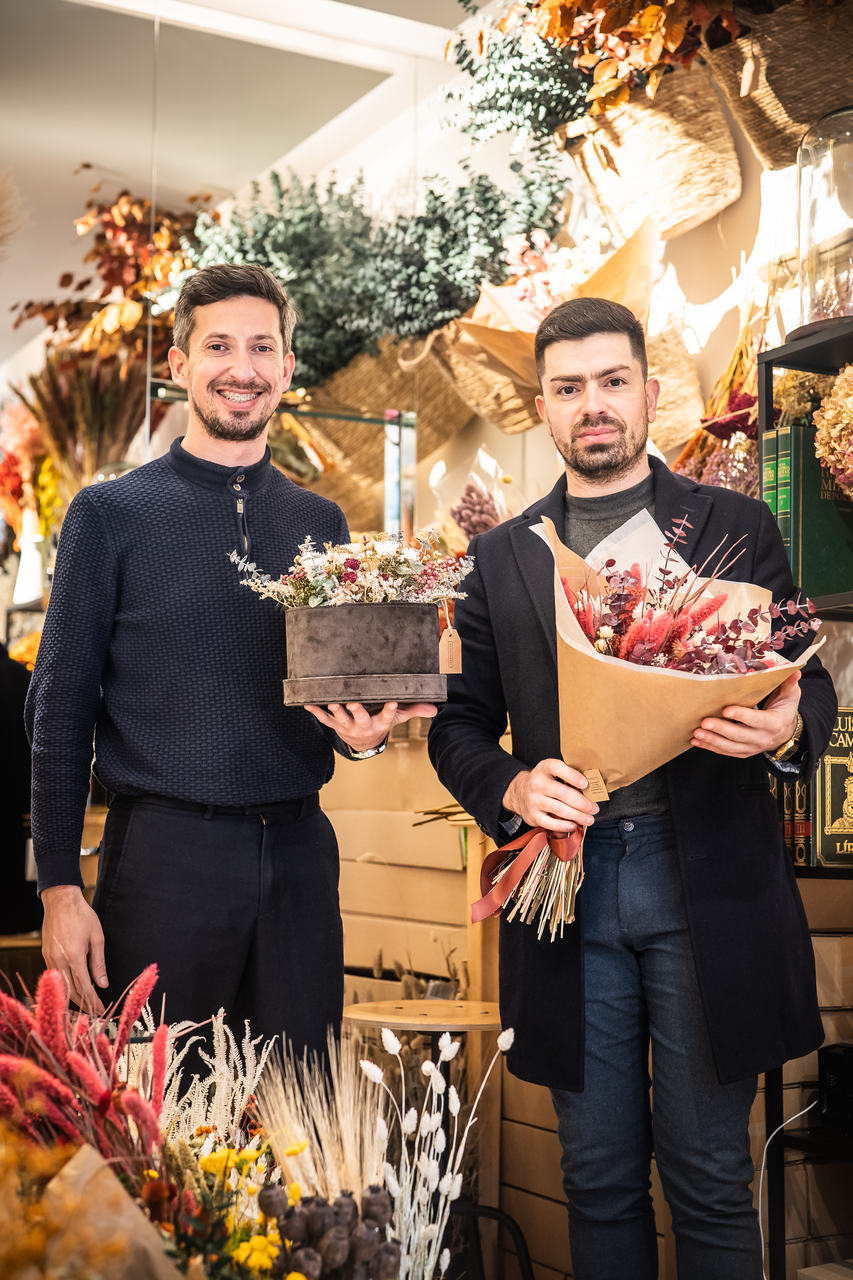 Na Terracotta Flower Studio, Tiago e Bruno transformam um arranjo floral perecível numa peça de decoração que perdura no tempo. A maior parte das flores chega da Holanda, mas também se veem algumas penduradas pela loja a secar naturalmente. Para oferecer ou complementar a decoração de Natal, há flores em vasos e cestos, ramos e cúpulas florais, coroas de Natal e centros de mesa, com os tons quentes da quadra. AC