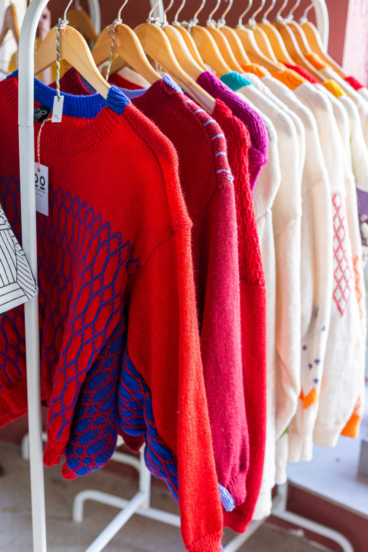 Onde ficava a loja Hello, Bonfim está agora um espaço sem nome definido, onde coabitam diferentes projetos e que serve de montra a marcas portuguesas de autor, com destaque para a Wayz (calçado) e a Snool (vestuário). Podemos chamar-lhe, simplesmente, Atelier, sugere Maria João dos Reis, que cria camisolas de malha coloridas, únicas e de edição limitada, de forma manual, com a etiqueta Snool. Tudo começou com uma necessidade própria: não encontrava peças de malha originais, o que a levou ao faça você mesmo: primeiro à mão, depois com recurso a uma máquina japonesa, dos anos 1970, que descreve como um tear de tricô. Ainda o usa, e entretanto juntou-lhe outro, da década de 1980.